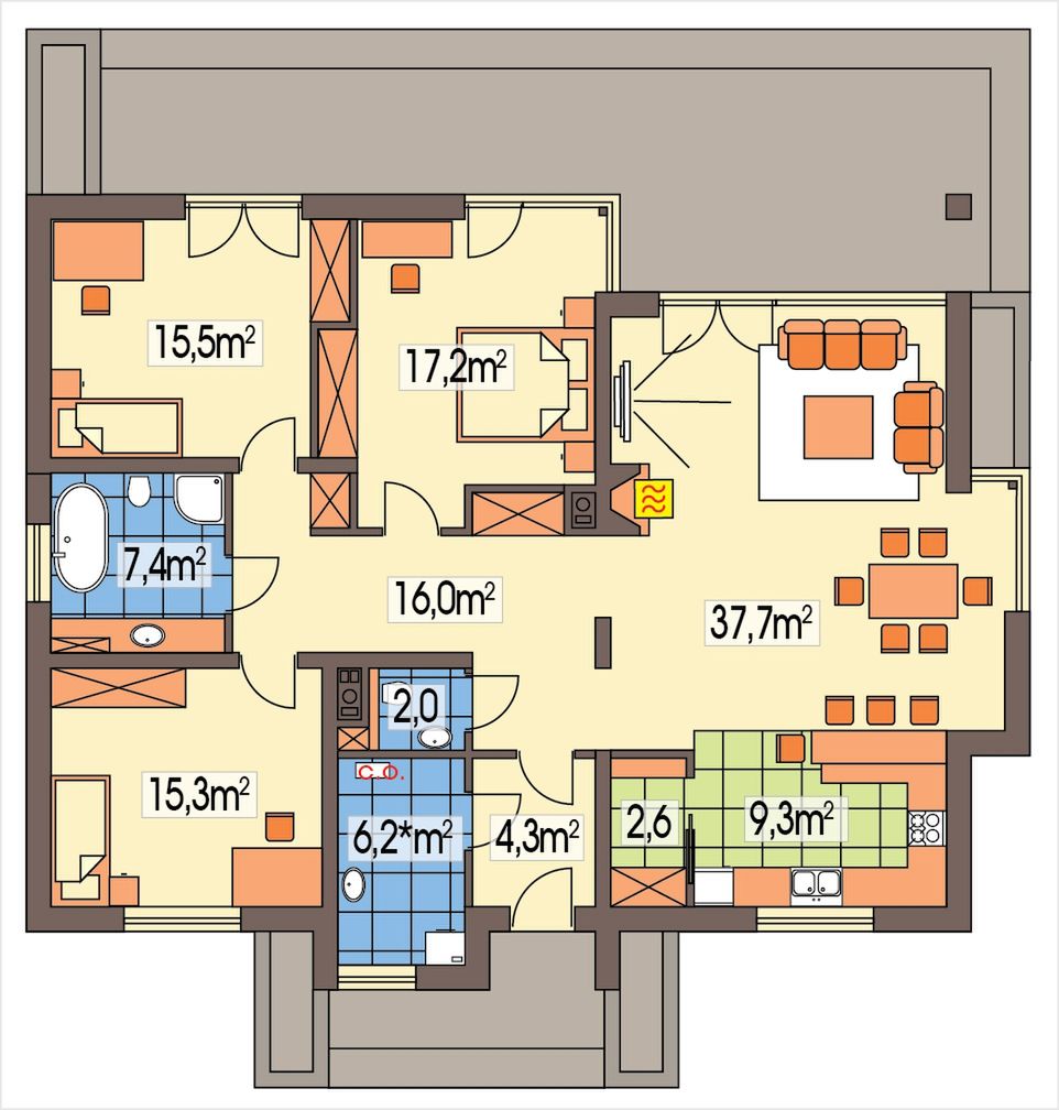 Graficzne opracowanie rzutów poglądowych widocznych na karcie projektu zostało wykonane przez Extradom.pl. Prezentowane przez Extradom.pl wizualizacje wykonane zostały przez autora projektu i należy poczytywać je jedynie za przykład i propozycję wykończenia, wizję architektoniczną autora projektu. Ostateczne wykończenie budynku może nastąpić na wiele sposobów. Szczegółowe rozwiązania zastosowane w oferowanej dokumentacji - w tym również ilość, lokalizacje i wygląd okien, drzwi, kominów - mogą w niewielkim stopniu różnić się od prezentowanej wizualizacji budynku.