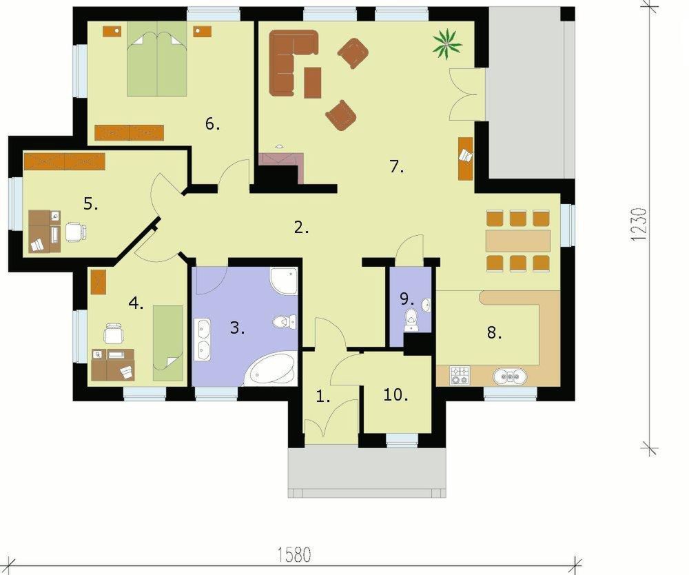 Graficzne opracowanie rzutów poglądowych widocznych na karcie projektu zostało wykonane przez Extradom.pl. Prezentowane przez Extradom.pl wizualizacje wykonane zostały przez autora projektu i należy poczytywać je jedynie za przykład i propozycję wykończenia, wizję architektoniczną autora projektu. Ostateczne wykończenie budynku może nastąpić na wiele sposobów. Szczegółowe rozwiązania zastosowane w oferowanej dokumentacji - w tym również ilość, lokalizacje i wygląd okien, drzwi, kominów - mogą w niewielkim stopniu różnić się od prezentowanej wizualizacji budynku.