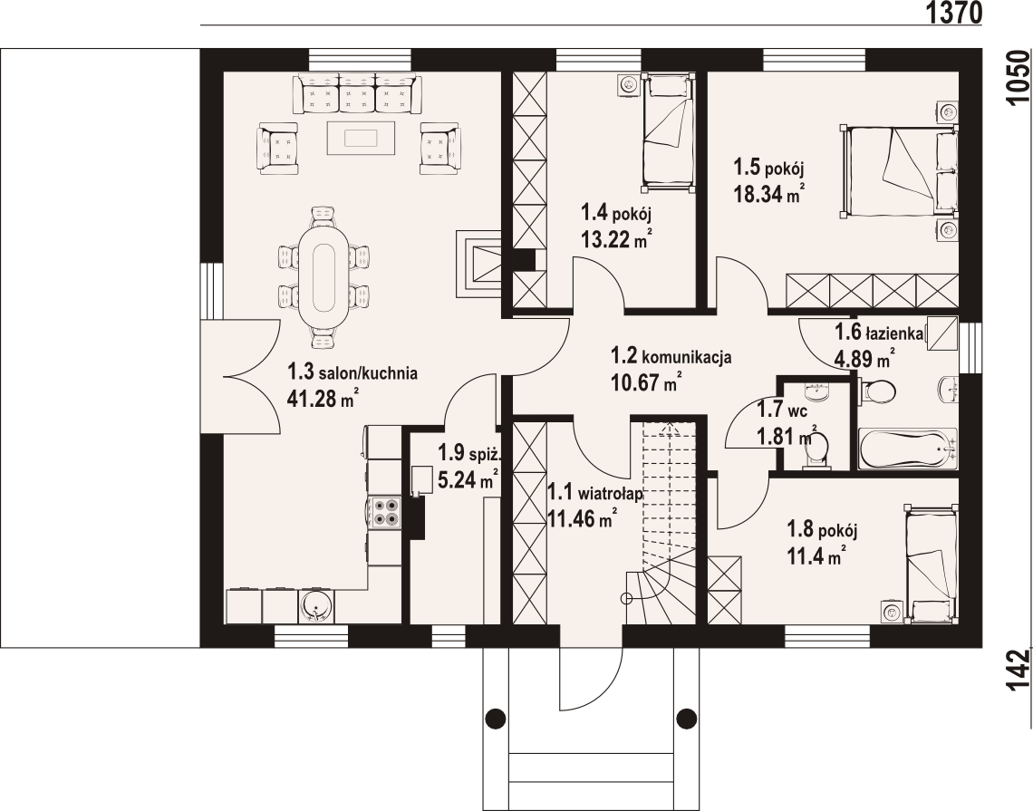 Wysokość ścianki kolankowej: 0.67 m. Strop: płyta żelbetowa. Pokrycie dachu: dachówka ceramiczna. Ściany zewnętrzne: pustaki ceramiczne + styropian. Ściany wewnętrzne: pustaki ceramiczne. Typ ogrzewania: kocioł gazowy. Instalacje dodatkowe: instalacja solarna.