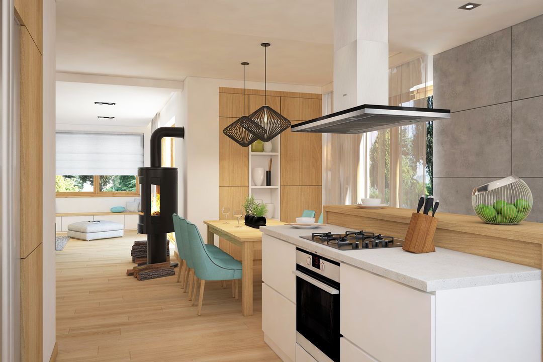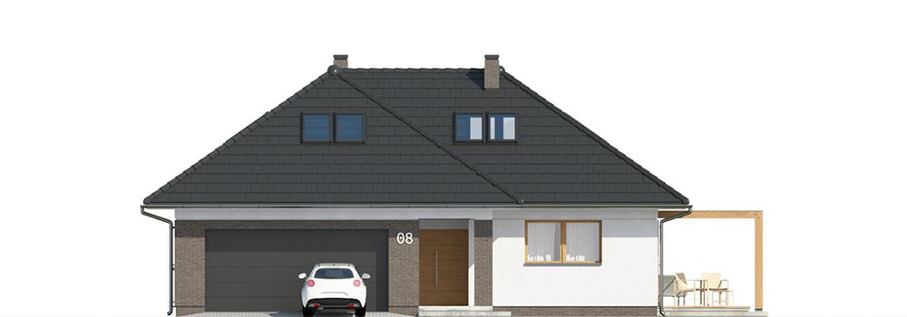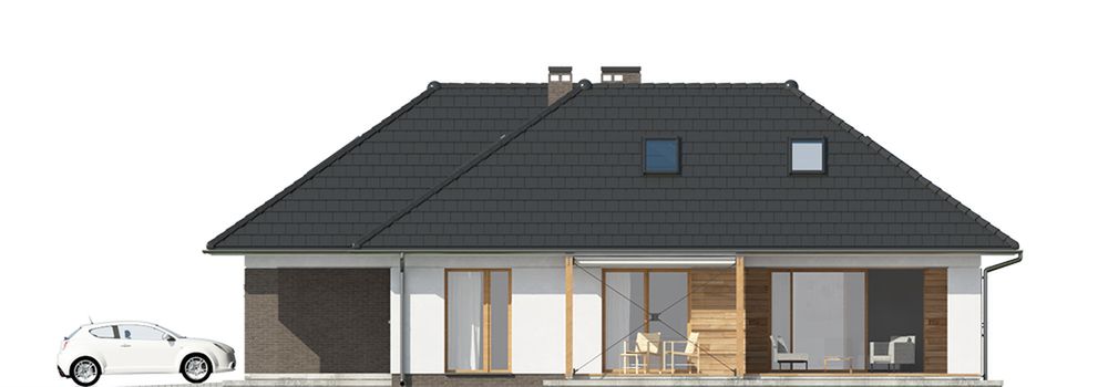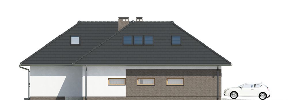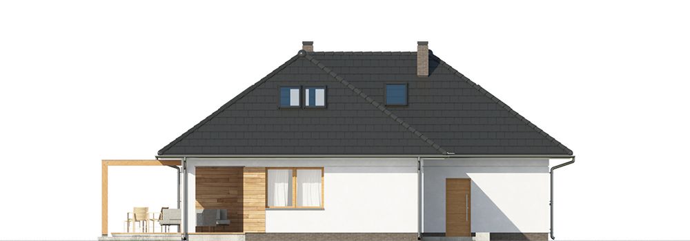 Graficzne opracowanie rzutów poglądowych widocznych na karcie projektu zostało wykonane przez Extradom.pl. Prezentowane przez Extradom.pl wizualizacje wykonane zostały przez autora projektu i należy poczytywać je jedynie za przykład i propozycję wykończenia, wizję architektoniczną autora projektu. Ostateczne wykończenie budynku może nastąpić na wiele sposobów. Szczegółowe rozwiązania zastosowane w oferowanej dokumentacji - w tym również ilość, lokalizacje i wygląd okien, drzwi, kominów - mogą w niewielkim stopniu różnić się od prezentowanej wizualizacji budynku.