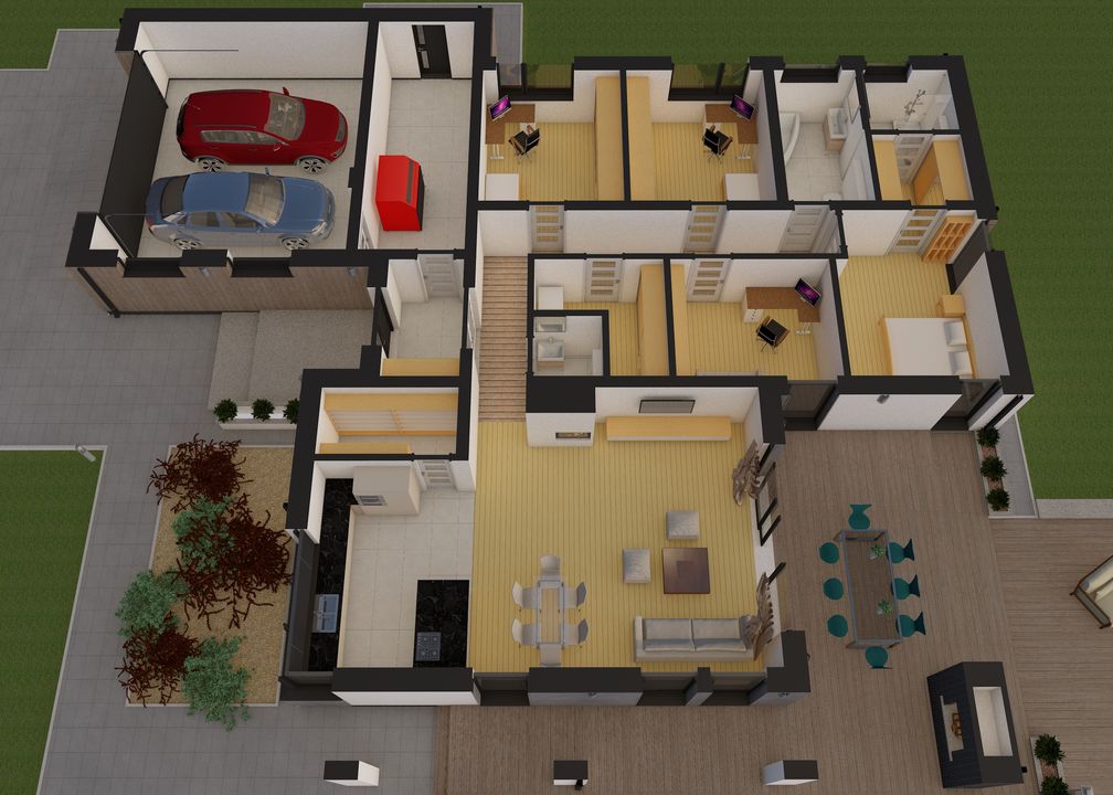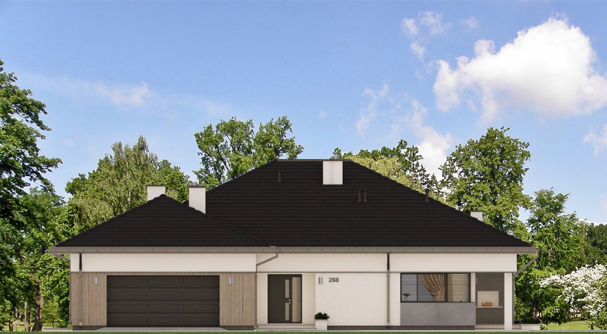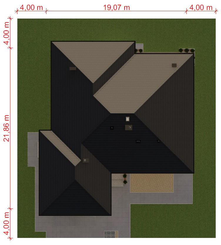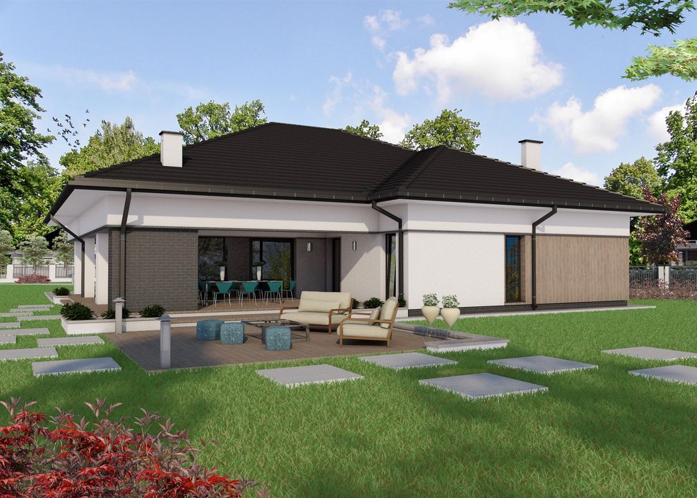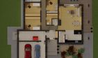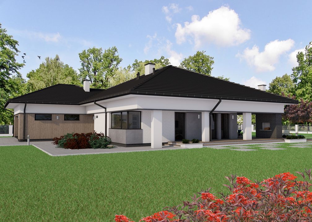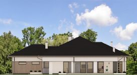 Graficzne opracowanie rzutów poglądowych widocznych na karcie projektu zostało wykonane przez Extradom.pl. Prezentowane przez Extradom.pl wizualizacje wykonane zostały przez autora projektu i należy poczytywać je jedynie za przykład i propozycję wykończenia, wizję architektoniczną autora projektu. Ostateczne wykończenie budynku może nastąpić na wiele sposobów. Szczegółowe rozwiązania zastosowane w oferowanej dokumentacji - w tym również ilość, lokalizacje i wygląd okien, drzwi, kominów - mogą w niewielkim stopniu różnić się od prezentowanej wizualizacji budynku.