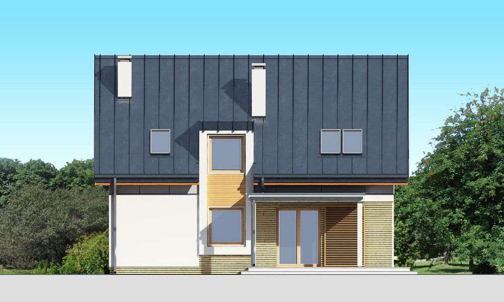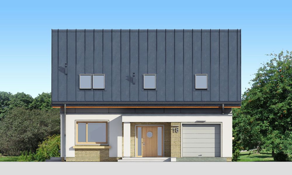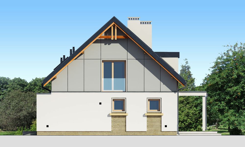 Graficzne opracowanie rzutów poglądowych widocznych na karcie projektu zostało wykonane przez Extradom.pl. Prezentowane przez Extradom.pl wizualizacje wykonane zostały przez autora projektu i należy poczytywać je jedynie za przykład i propozycję wykończenia, wizję architektoniczną autora projektu. Ostateczne wykończenie budynku może nastąpić na wiele sposobów. Szczegółowe rozwiązania zastosowane w oferowanej dokumentacji - w tym również ilość, lokalizacje i wygląd okien, drzwi, kominów - mogą w niewielkim stopniu różnić się od prezentowanej wizualizacji budynku.