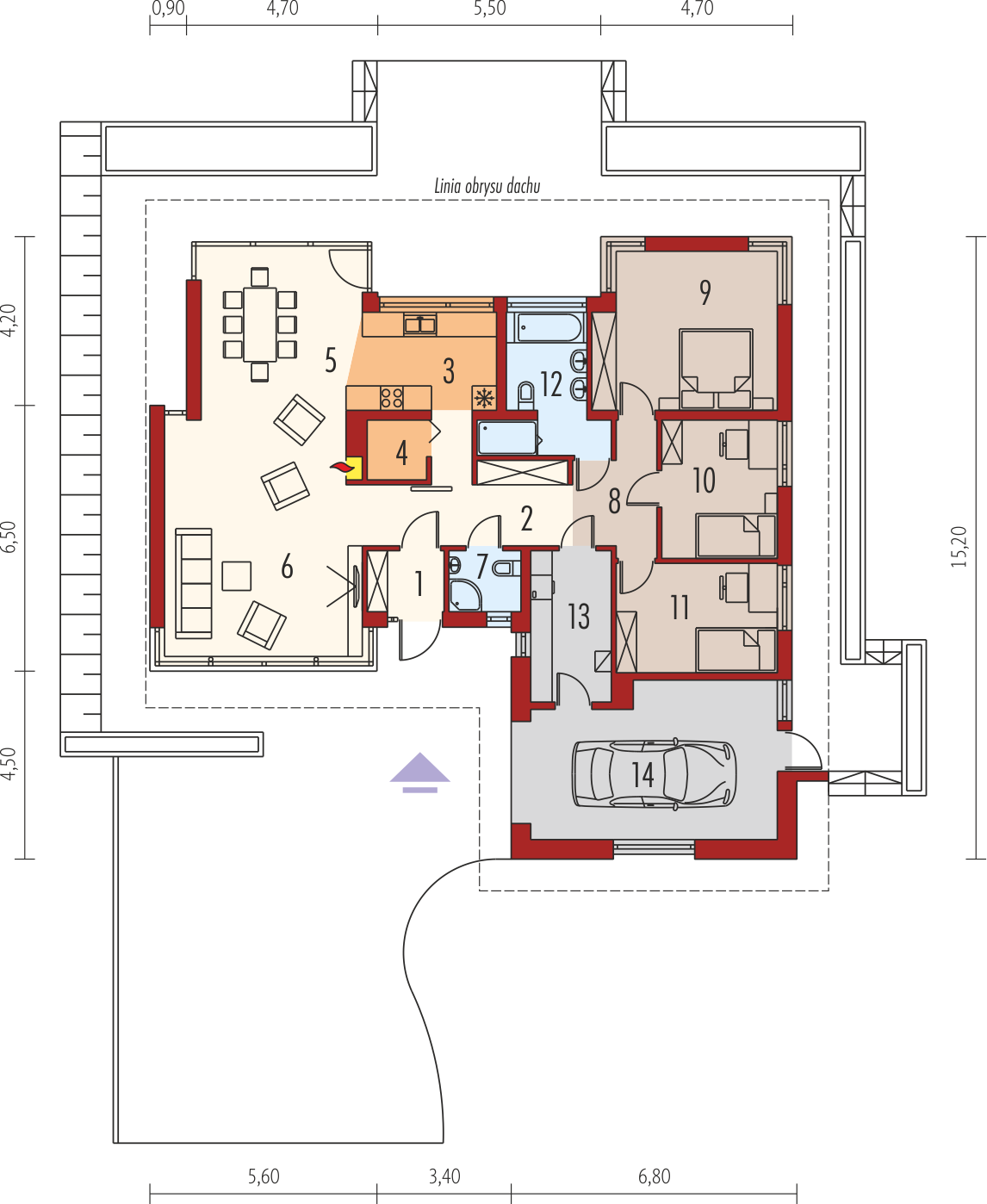 Graficzne opracowanie rzutów poglądowych widocznych na karcie projektu zostało wykonane przez Extradom.pl. Prezentowane przez Extradom.pl wizualizacje wykonane zostały przez autora projektu i należy poczytywać je jedynie za przykład i propozycję wykończenia, wizję architektoniczną autora projektu. Ostateczne wykończenie budynku może nastąpić na wiele sposobów. Szczegółowe rozwiązania zastosowane w oferowanej dokumentacji - w tym również ilość, lokalizacje i wygląd okien, drzwi, kominów - mogą w niewielkim stopniu różnić się od prezentowanej wizualizacji budynku.