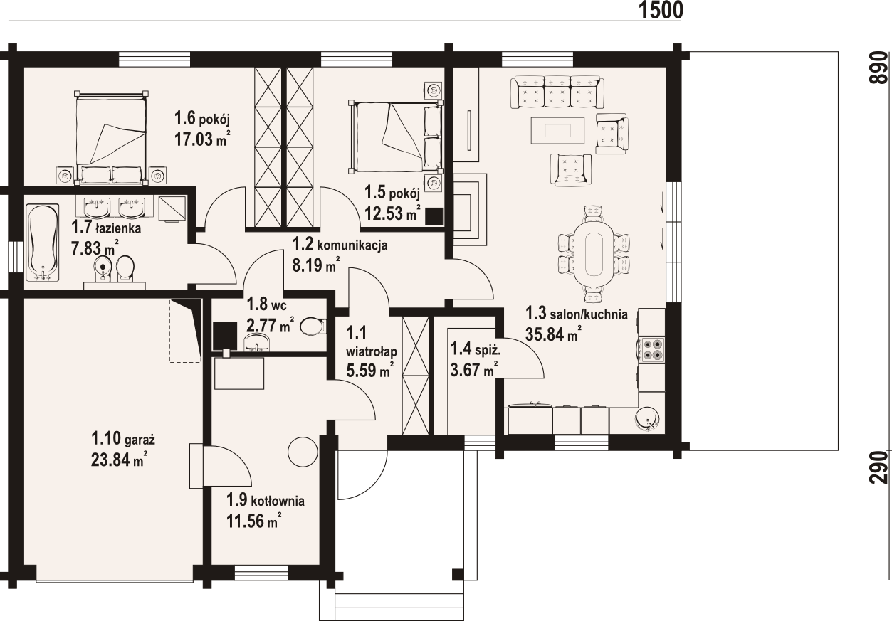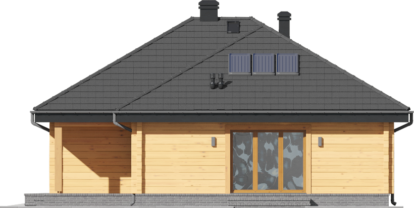 Graficzne opracowanie rzutów poglądowych widocznych na karcie projektu zostało wykonane przez Extradom.pl. Prezentowane przez Extradom.pl wizualizacje wykonane zostały przez autora projektu i należy poczytywać je jedynie za przykład i propozycję wykończenia, wizję architektoniczną autora projektu. Ostateczne wykończenie budynku może nastąpić na wiele sposobów. Szczegółowe rozwiązania zastosowane w oferowanej dokumentacji - w tym również ilość, lokalizacje i wygląd okien, drzwi, kominów - mogą w niewielkim stopniu różnić się od prezentowanej wizualizacji budynku.