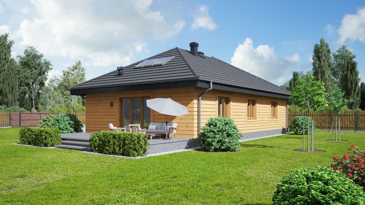 Wysokość ścianki kolankowej: 0.19 m. Strop: drewniany. Pokrycie dachu: dachówka gontopodobna Gerard Corona. Ściany zewnętrzne: płazy drewniane + wełna mineralna + deska. Ściany wewnętrzne: szkieletowe drewniane. Typ ogrzewania: kocioł gazowy lub kocioł na paliwo stałe. Instalacje dodatkowe: instalacja solarna. Inne: brama garażowa i drzwi Hörmann.