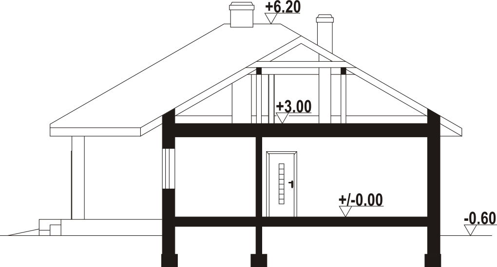 Wysokość ścianki kolankowej: 0.25 m. Strop: płyta żelbetowa. Pokrycie dachu: dachówka ceramiczna Koramic. Ściany zewnętrzne: pustaki ceramiczne Porotherm + styropian. Ściany wewnętrzne: pustaki ceramiczne Porotherm. Typ ogrzewania: kocioł gazowy lub kocioł na paliwo stałe. Instalacje dodatkowe: instalacja solarna. Inne: brama garażowa i drzwi Hörmann.