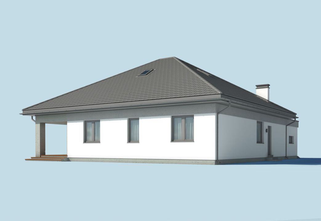 Graficzne opracowanie rzutów poglądowych widocznych na karcie projektu zostało wykonane przez Extradom.pl. Prezentowane przez Extradom.pl wizualizacje wykonane zostały przez autora projektu i należy poczytywać je jedynie za przykład i propozycję wykończenia, wizję architektoniczną autora projektu. Ostateczne wykończenie budynku może nastąpić na wiele sposobów. Szczegółowe rozwiązania zastosowane w oferowanej dokumentacji - w tym również ilość, lokalizacje i wygląd okien, drzwi, kominów - mogą w niewielkim stopniu różnić się od prezentowanej wizualizacji budynku.