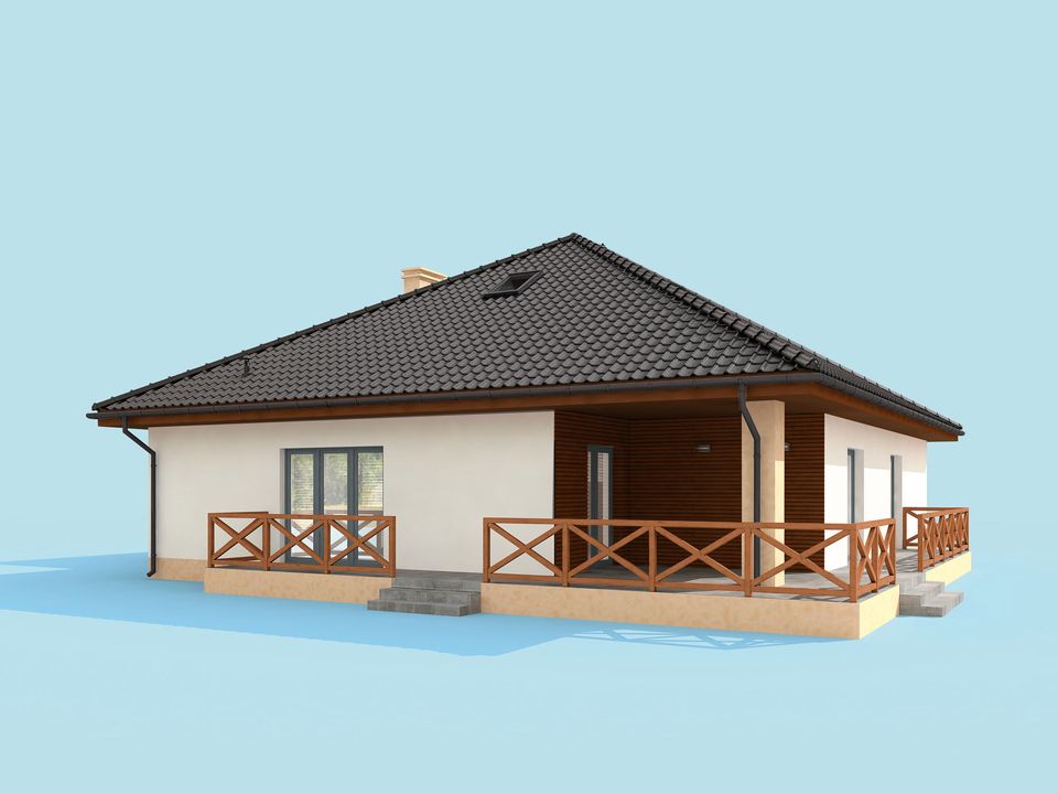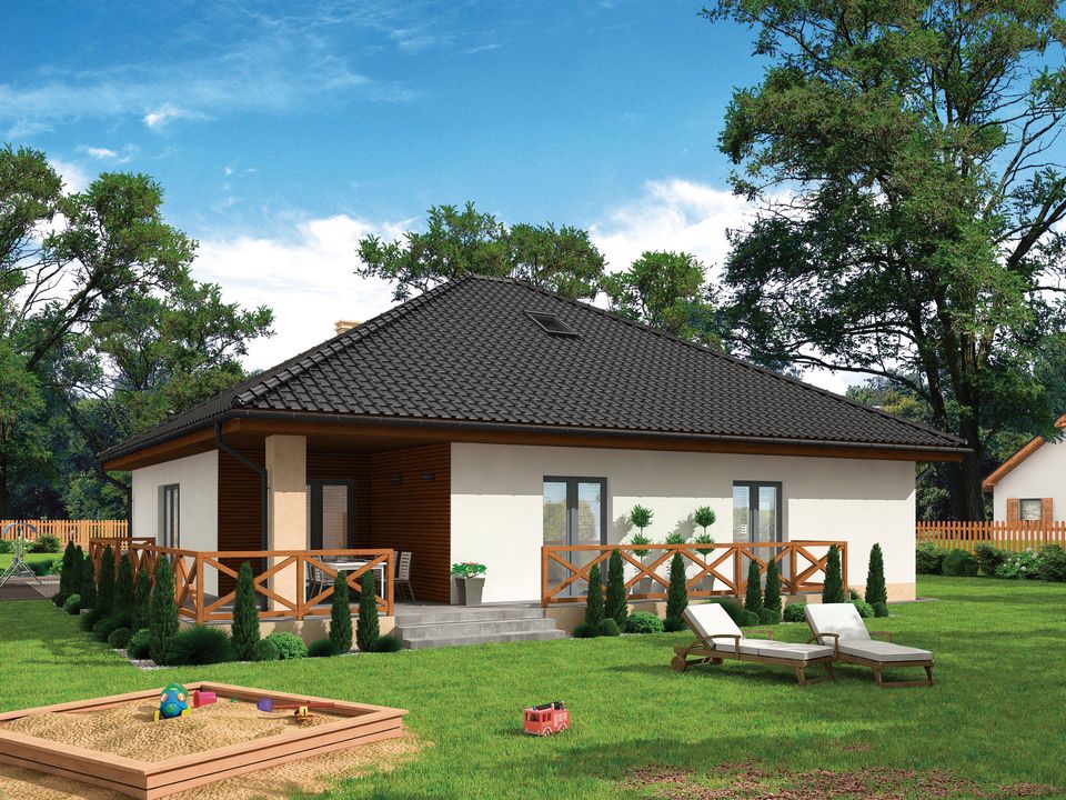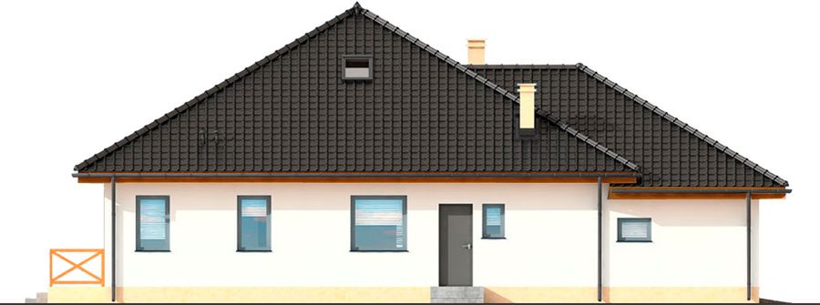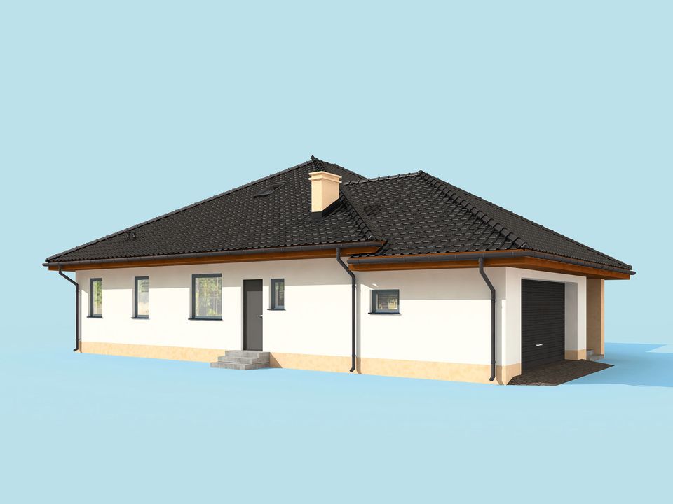 Graficzne opracowanie rzutów poglądowych widocznych na karcie projektu zostało wykonane przez Extradom.pl. Prezentowane przez Extradom.pl wizualizacje wykonane zostały przez autora projektu i należy poczytywać je jedynie za przykład i propozycję wykończenia, wizję architektoniczną autora projektu. Ostateczne wykończenie budynku może nastąpić na wiele sposobów. Szczegółowe rozwiązania zastosowane w oferowanej dokumentacji - w tym również ilość, lokalizacje i wygląd okien, drzwi, kominów - mogą w niewielkim stopniu różnić się od prezentowanej wizualizacji budynku.