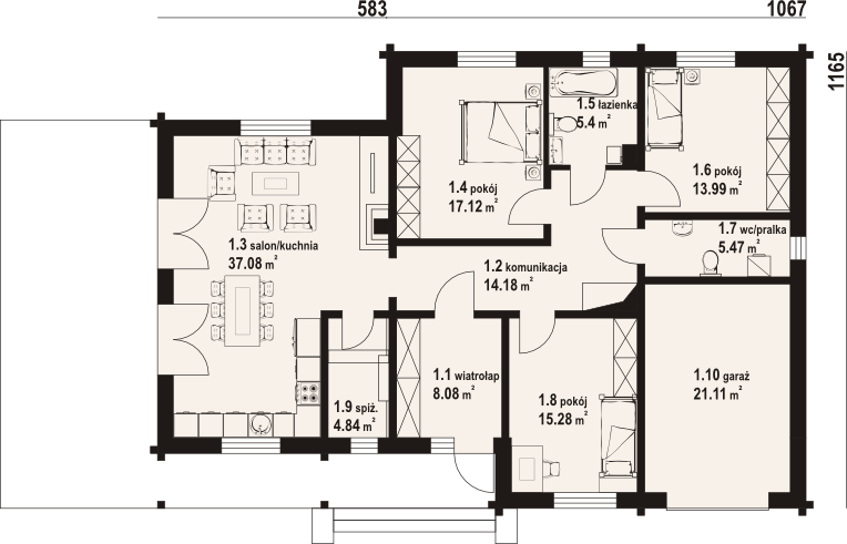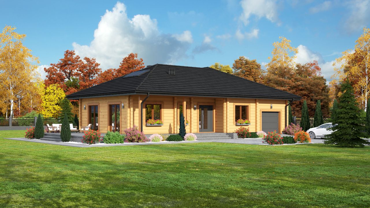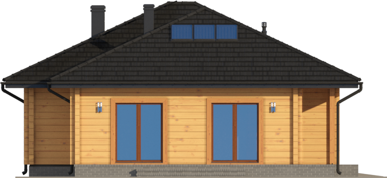 Strop: drewniany. Pokrycie dachu: dachówka ceramiczna. Ściany zewnętrzne: płazy drewniane + wełna mineralna + deska. Ściany wewnętrzne: płazy drewniane. Typ ogrzewania: kocioł gazowy. Instalacje dodatkowe: instalacja solarna. Inne: brama garażowa Hörmann.