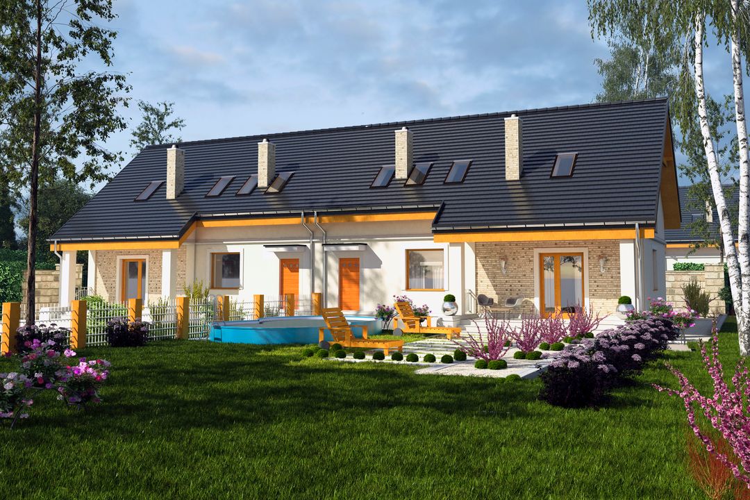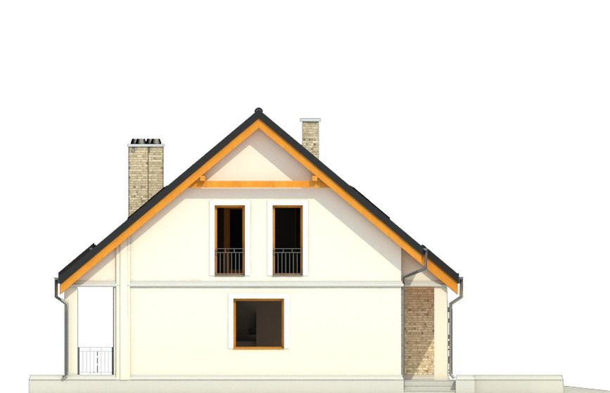 Graficzne opracowanie rzutów poglądowych widocznych na karcie projektu zostało wykonane przez Extradom.pl. Prezentowane przez Extradom.pl wizualizacje wykonane zostały przez autora projektu i należy poczytywać je jedynie za przykład i propozycję wykończenia, wizję architektoniczną autora projektu. Ostateczne wykończenie budynku może nastąpić na wiele sposobów. Szczegółowe rozwiązania zastosowane w oferowanej dokumentacji - w tym również ilość, lokalizacje i wygląd okien, drzwi, kominów - mogą w niewielkim stopniu różnić się od prezentowanej wizualizacji budynku.