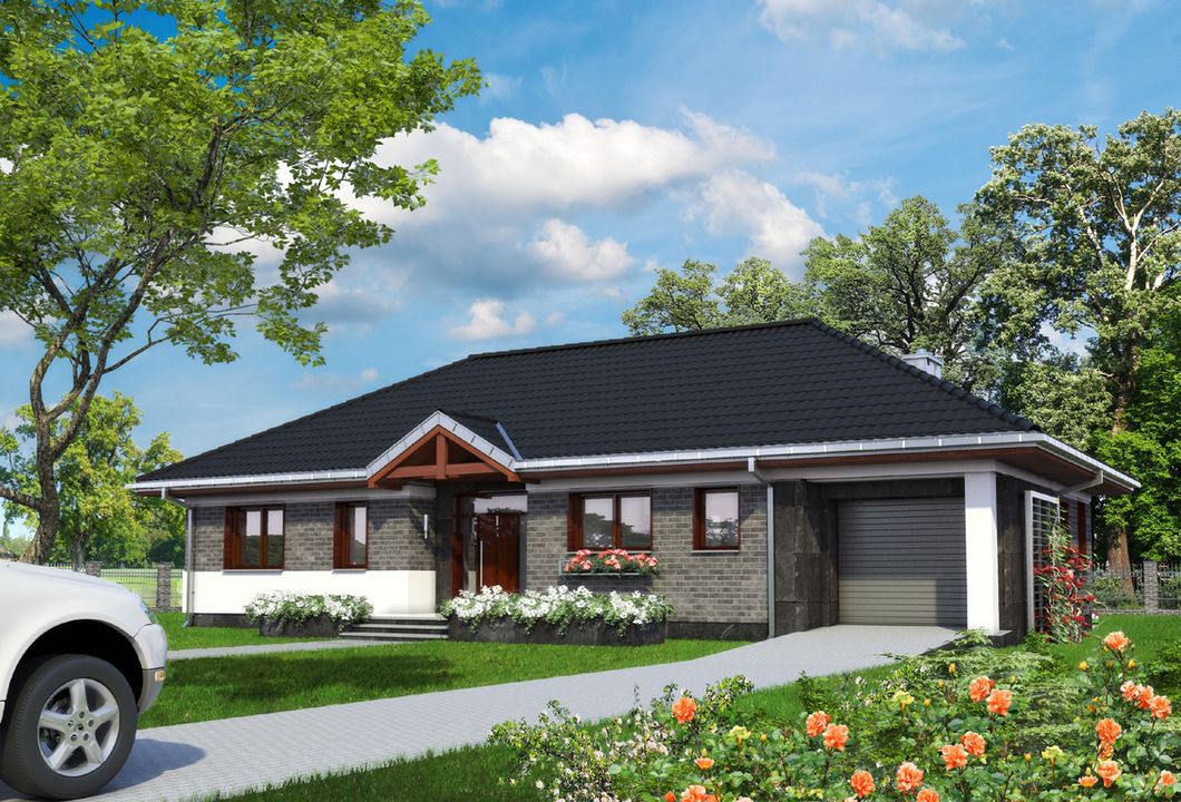 Technologia i konstrukcja: murowana – beton komórkowy. Ściany zewnętrzne: bloczki SOLBET Optimal gr. 24 cm gęstość 500 + docieplenie płyty styropianowe GOLD fasada gr. 15 cm firmy TERMOORGANIKA. Ściany wewnętrzne: bloczki SOLBET Optimal gr. 24 cm i 12 cm. Strop: lekki strop panelowy Smart firmy KONBET. Konstrukcja dachu: drewniana, mieszana. Rodzaj schodów: brak. Typ ogrzewania: kocioł na gaz. Wentylacja: mechaniczna. Aneks na paliwo stałe: na zamówienie. Pokrycie dachu: dachówka betonowa lub ceramiczna BRAAS. Elewacja: tynki firmy SICHER BAUTECHNIK, częściowo płytki klinkierowe i płyty elewacyjne.