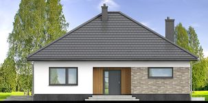 Graficzne opracowanie rzutów poglądowych widocznych na karcie projektu zostało wykonane przez Extradom.pl. Prezentowane przez Extradom.pl wizualizacje wykonane zostały przez autora projektu i należy poczytywać je jedynie za przykład i propozycję wykończenia, wizję architektoniczną autora projektu. Ostateczne wykończenie budynku może nastąpić na wiele sposobów. Szczegółowe rozwiązania zastosowane w oferowanej dokumentacji - w tym również ilość, lokalizacje i wygląd okien, drzwi, kominów - mogą w niewielkim stopniu różnić się od prezentowanej wizualizacji budynku.