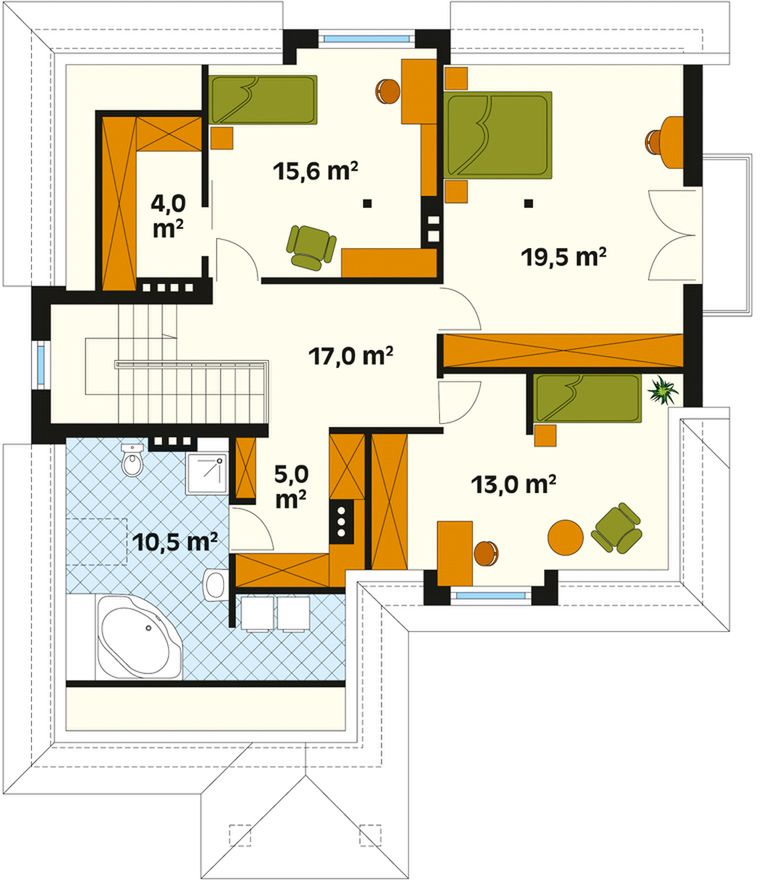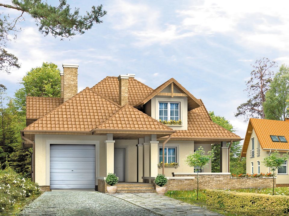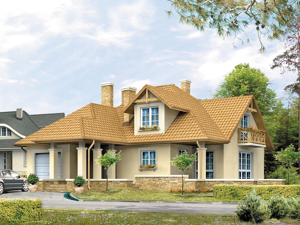 Graficzne opracowanie rzutów poglądowych widocznych na karcie projektu zostało wykonane przez Extradom.pl. Prezentowane przez Extradom.pl wizualizacje wykonane zostały przez autora projektu i należy poczytywać je jedynie za przykład i propozycję wykończenia, wizję architektoniczną autora projektu. Ostateczne wykończenie budynku może nastąpić na wiele sposobów. Szczegółowe rozwiązania zastosowane w oferowanej dokumentacji - w tym również ilość, lokalizacje i wygląd okien, drzwi, kominów - mogą w niewielkim stopniu różnić się od prezentowanej wizualizacji budynku.