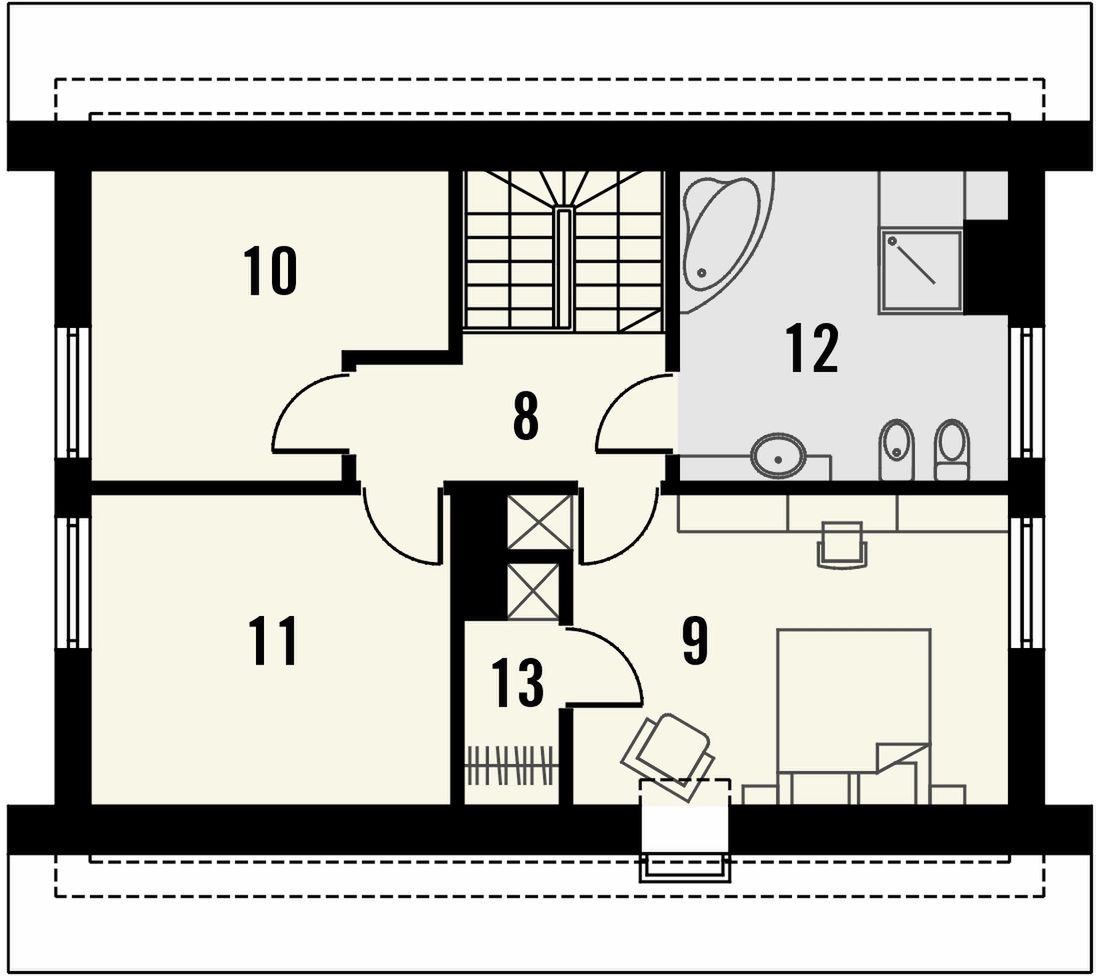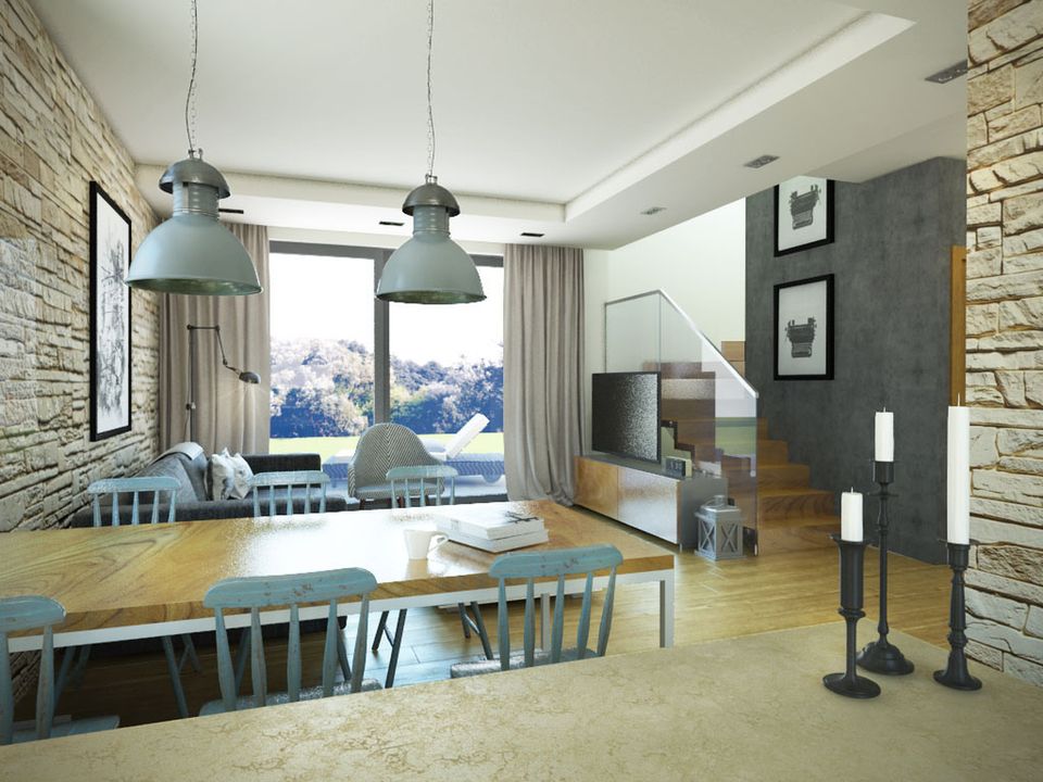 Graficzne opracowanie rzutów poglądowych widocznych na karcie projektu zostało wykonane przez Extradom.pl. Prezentowane przez Extradom.pl wizualizacje wykonane zostały przez autora projektu i należy poczytywać je jedynie za przykład i propozycję wykończenia, wizję architektoniczną autora projektu. Ostateczne wykończenie budynku może nastąpić na wiele sposobów. Szczegółowe rozwiązania zastosowane w oferowanej dokumentacji - w tym również ilość, lokalizacje i wygląd okien, drzwi, kominów - mogą w niewielkim stopniu różnić się od prezentowanej wizualizacji budynku.