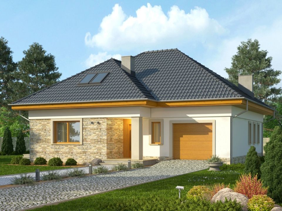 W projekcie ściany budynku przewidziane są z bloczków gazobetonowych. Z zewnątrz ocieplony jest styropianem gr. 12cm. Zaprojektowano strop gęstożebrowy TERIVA, konstrukcja więźby dachowej jest drewniana. Elewacje są częściowo otynkowane, częściowo obłożone płytkami kamiennymi lub klinkierowymi. Na etapie adaptacji możliwa jest zamiana materiałów na inne. Dokumentacja przygotowana jest także jako odbicie lustrzane.