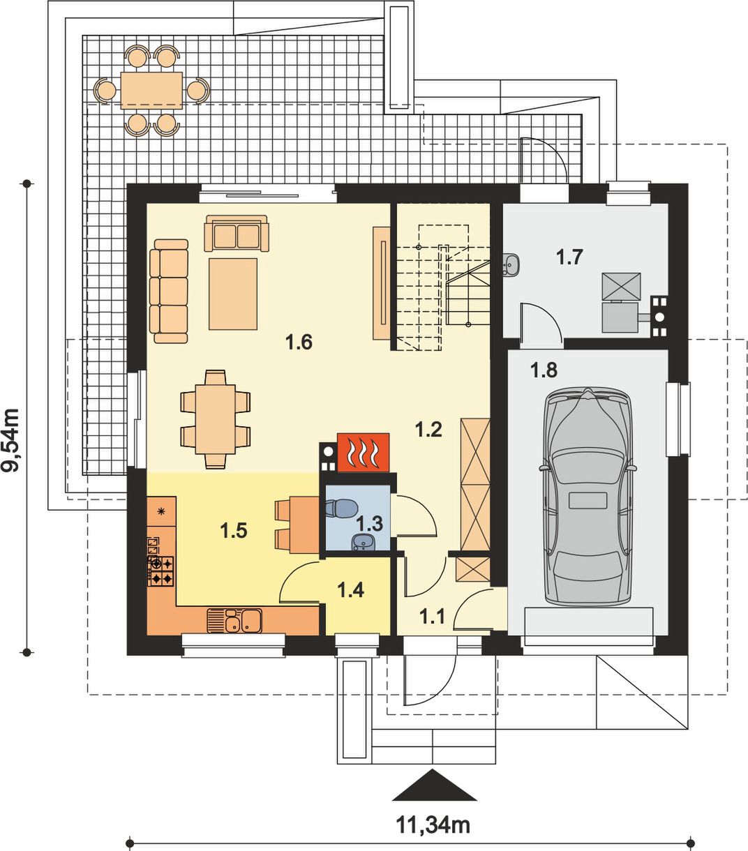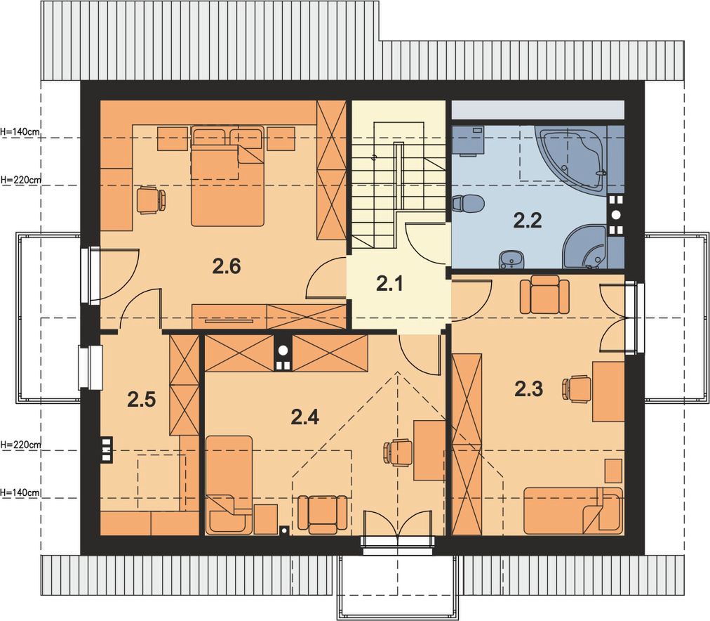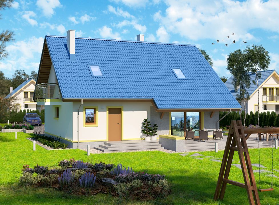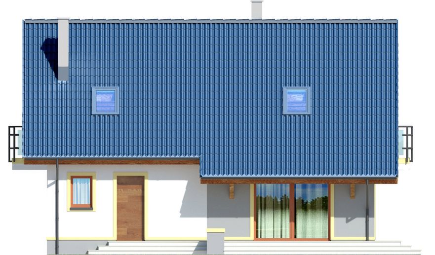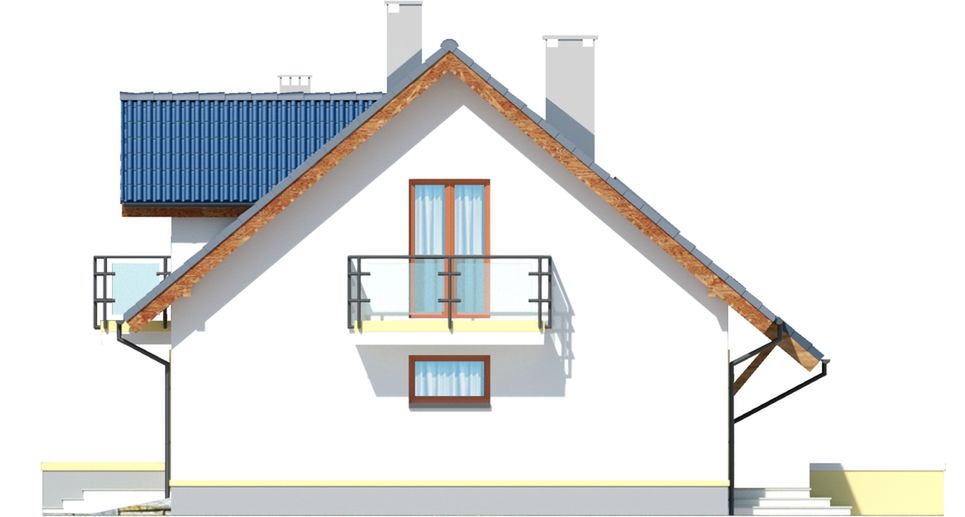 Graficzne opracowanie rzutów poglądowych widocznych na karcie projektu zostało wykonane przez Extradom.pl. Prezentowane przez Extradom.pl wizualizacje wykonane zostały przez autora projektu i należy poczytywać je jedynie za przykład i propozycję wykończenia, wizję architektoniczną autora projektu. Ostateczne wykończenie budynku może nastąpić na wiele sposobów. Szczegółowe rozwiązania zastosowane w oferowanej dokumentacji - w tym również ilość, lokalizacje i wygląd okien, drzwi, kominów - mogą w niewielkim stopniu różnić się od prezentowanej wizualizacji budynku.