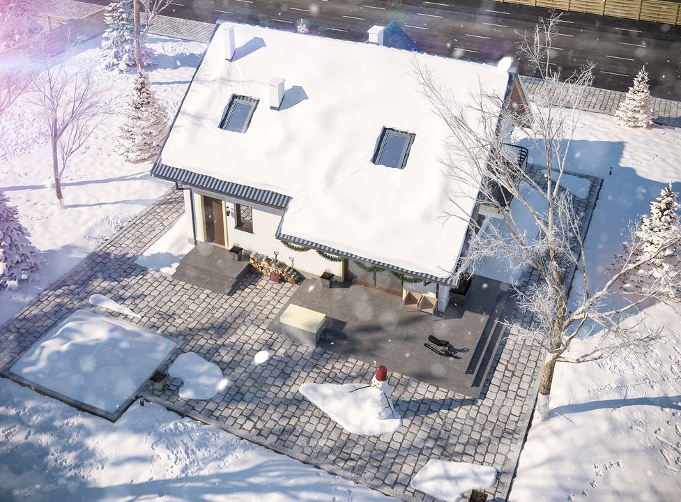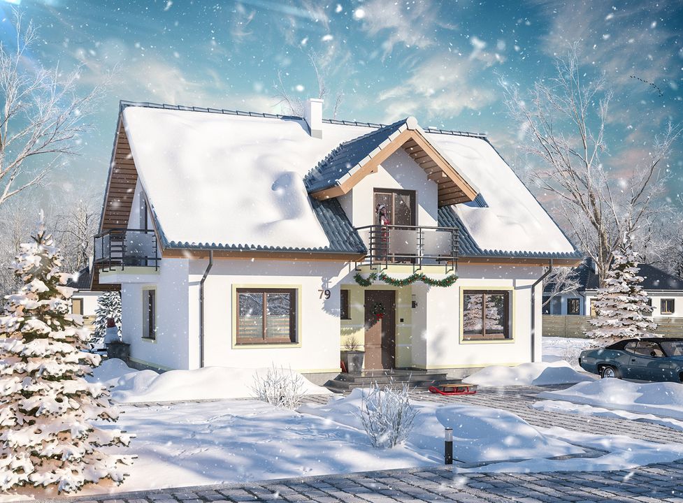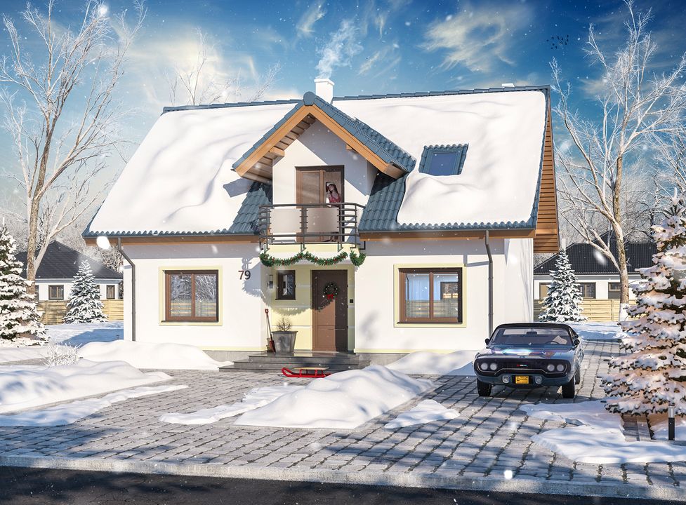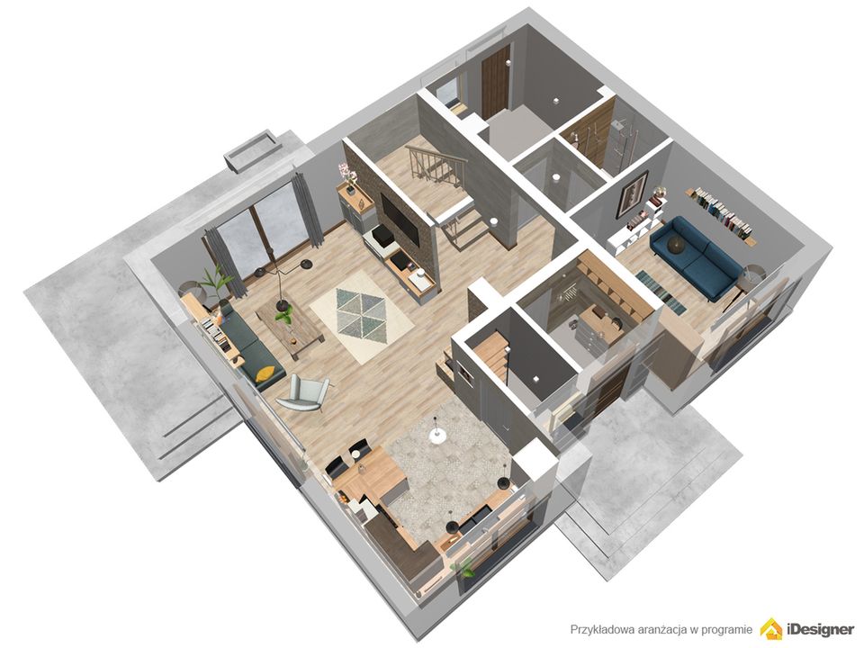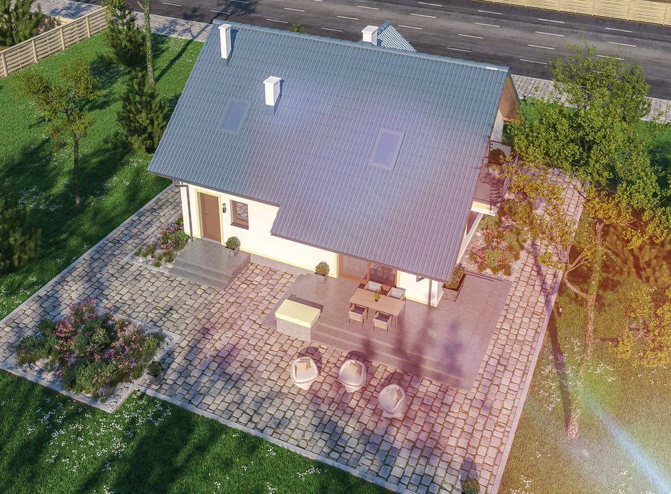 Graficzne opracowanie rzutów poglądowych widocznych na karcie projektu zostało wykonane przez Extradom.pl. Prezentowane przez Extradom.pl wizualizacje wykonane zostały przez autora projektu i należy poczytywać je jedynie za przykład i propozycję wykończenia, wizję architektoniczną autora projektu. Ostateczne wykończenie budynku może nastąpić na wiele sposobów. Szczegółowe rozwiązania zastosowane w oferowanej dokumentacji - w tym również ilość, lokalizacje i wygląd okien, drzwi, kominów - mogą w niewielkim stopniu różnić się od prezentowanej wizualizacji budynku.