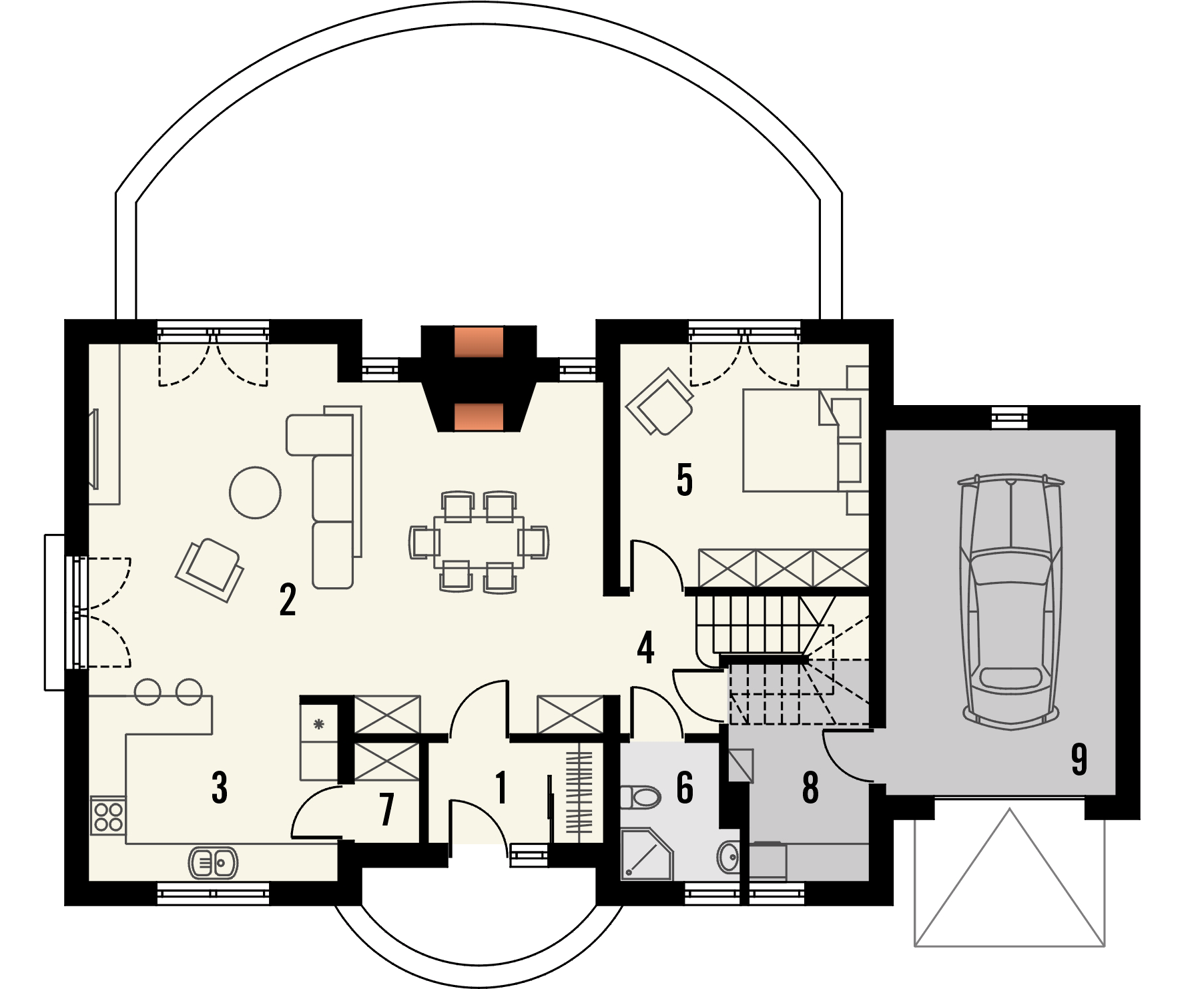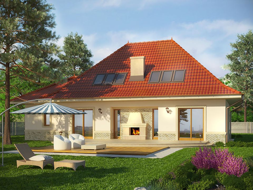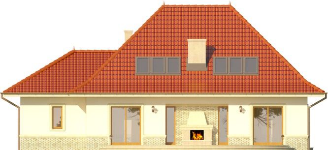 Graficzne opracowanie rzutów poglądowych widocznych na karcie projektu zostało wykonane przez Extradom.pl. Prezentowane przez Extradom.pl wizualizacje wykonane zostały przez autora projektu i należy poczytywać je jedynie za przykład i propozycję wykończenia, wizję architektoniczną autora projektu. Ostateczne wykończenie budynku może nastąpić na wiele sposobów. Szczegółowe rozwiązania zastosowane w oferowanej dokumentacji - w tym również ilość, lokalizacje i wygląd okien, drzwi, kominów - mogą w niewielkim stopniu różnić się od prezentowanej wizualizacji budynku.