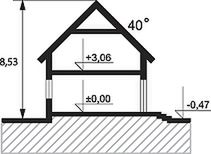 Ściany: 2-warstwowe - pustak ceramiczny + styropian. Stropy: żelbetowe, wylewane. Dach: blacha na rąbek stojący Ruukki Classic, kąt nachylenia 40°. Ogrzewanie: gazowe, pakiet "Kotłownia na paliwo stałe", olejowe.