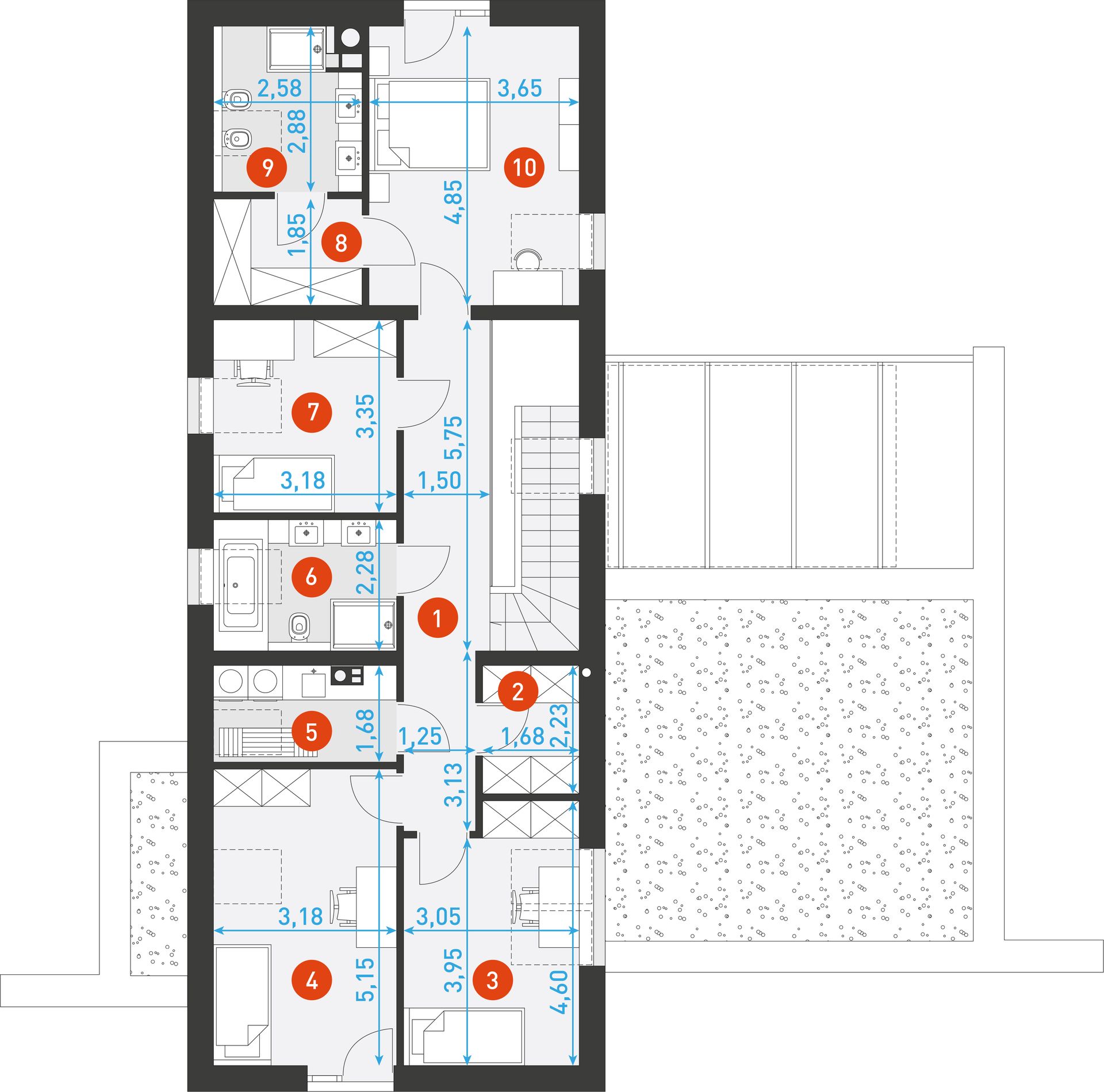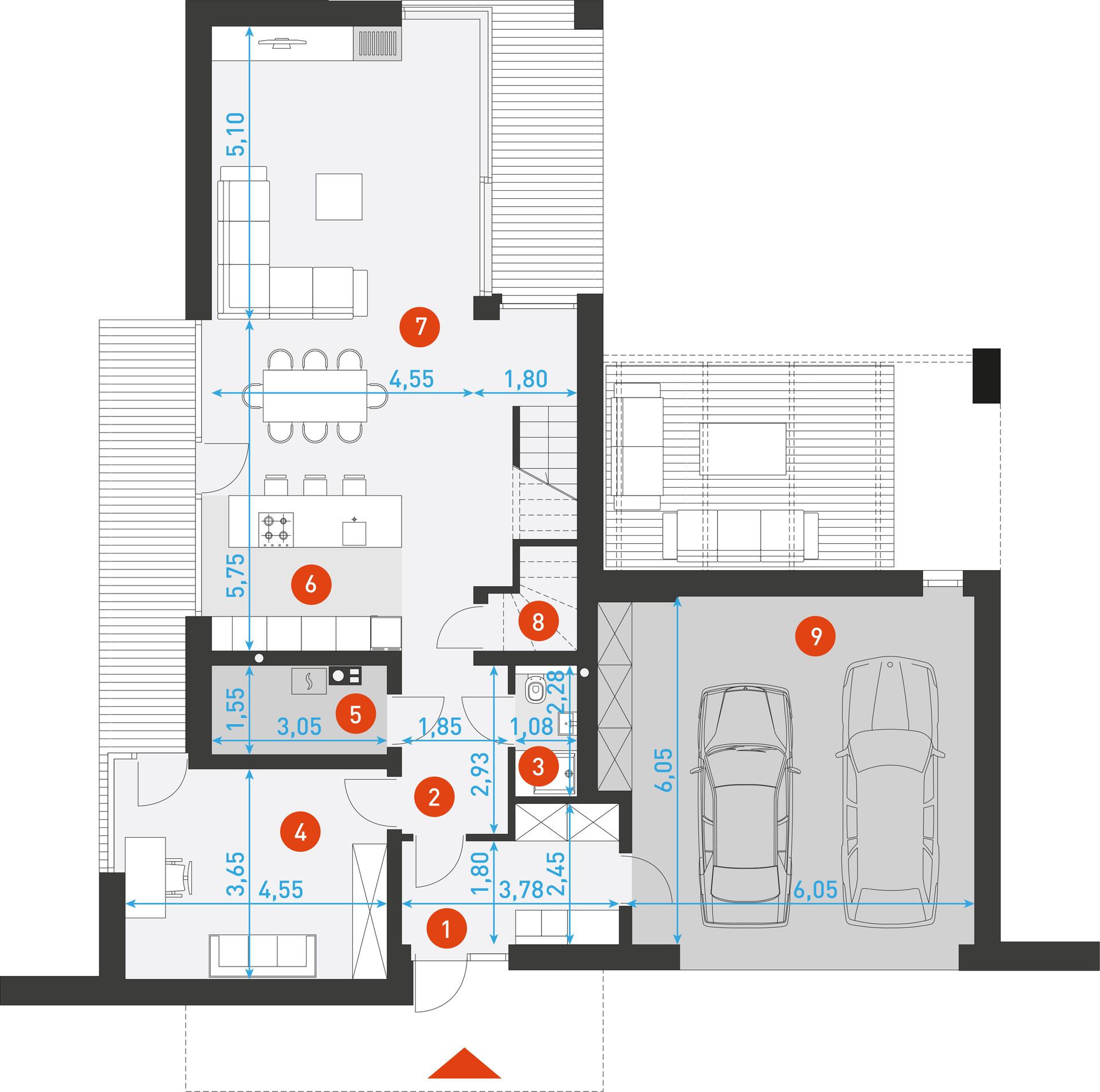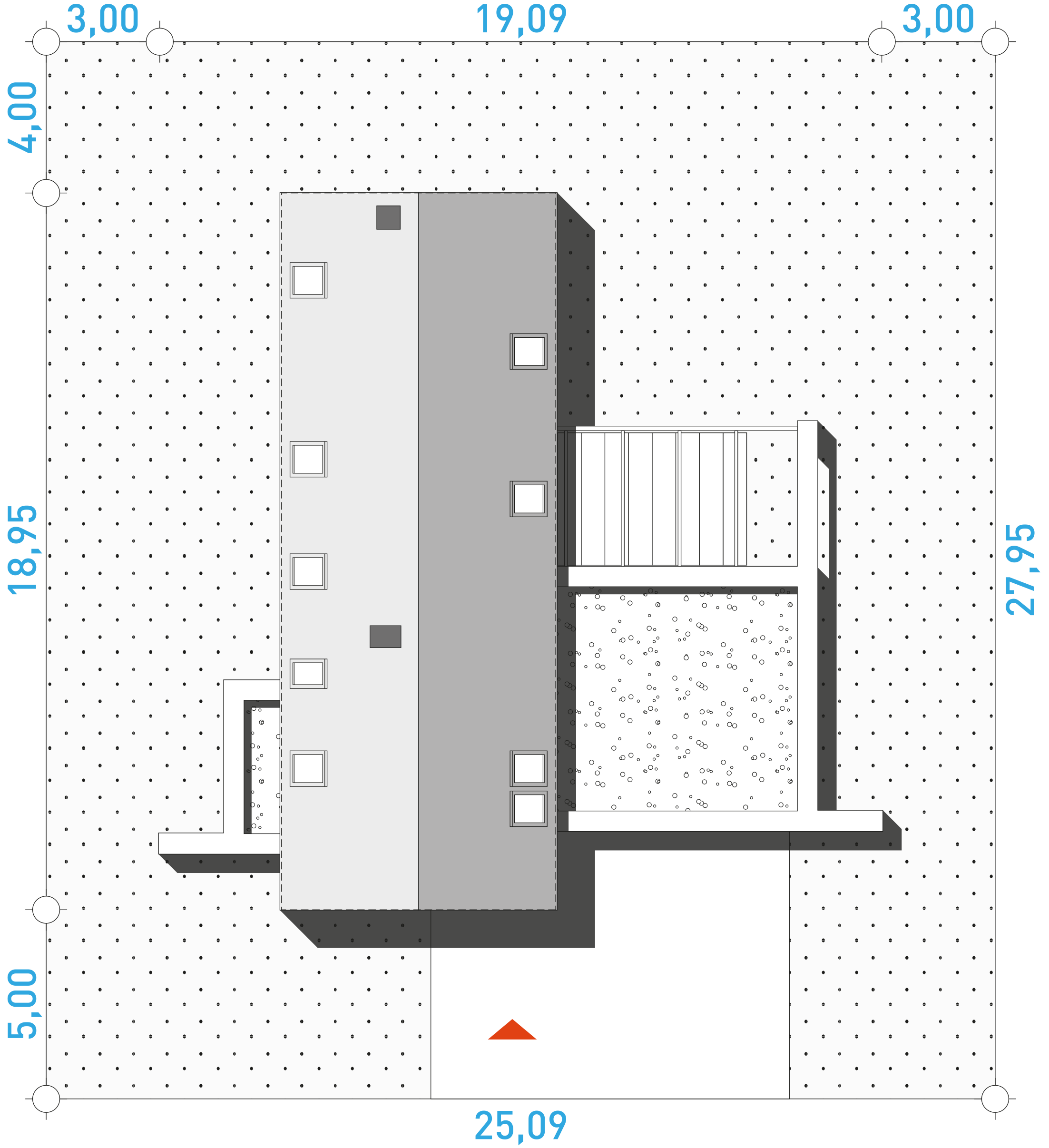 Konstrukcja: zgodna z normami EUROKOD. Fundamenty: tradycyjne ławy i stopy żelbetowe. Ściany: bloczek silikatowy + styropian na etapie adaptacji można zamienić na inny materiał o tej samej wytrzymałości na ściskanie 10-15 MPa, np. pustak ceramiczny. Elewacja: tynk, płytka kliknierowa ręcznie formowana materiał dodatkowy podkreślający podziały elewacji, taki jak płytka klinkierowa można zamienić na inny, np. drewno. Stropy: żelbetowe wylewane na etapie adaptacji istnieje możliwość zmiany na stropy gęstożebrowe. Schody: żelbetowe konstrukcja schodów oraz materiały wykończeniowe przewidziane do indywidualnej aranżacji. Możesz skorzystać z usług naszego partnera. Formularz dostępny w zakładce „kosztorys” Dach: blacha ocynkowana Plannja Emka Click konstrukcja więźby przewidziana pod pokrycie ciężkie dla I strefy wiatrowej i II strefy śniegowej.