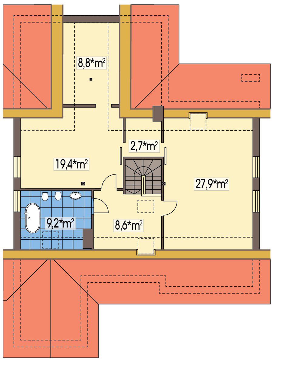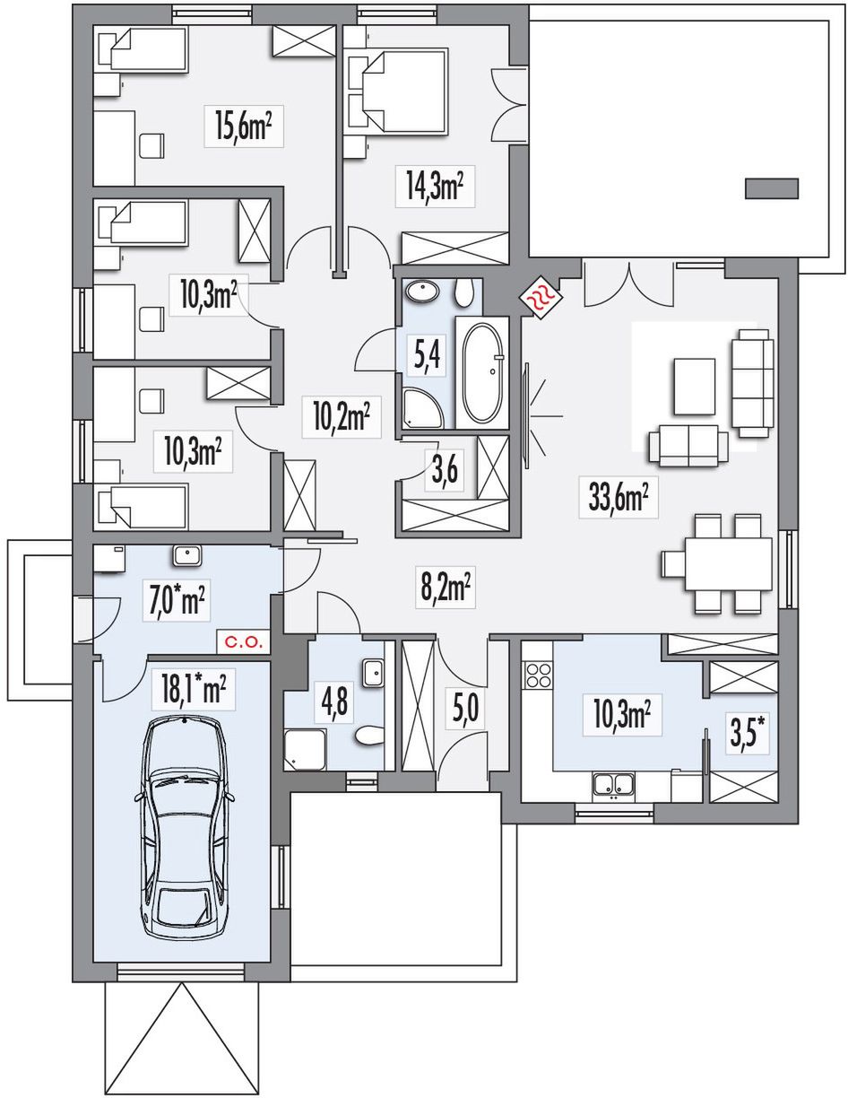 Graficzne opracowanie rzutów poglądowych widocznych na karcie projektu zostało wykonane przez Extradom.pl. Prezentowane przez Extradom.pl wizualizacje wykonane zostały przez autora projektu i należy poczytywać je jedynie za przykład i propozycję wykończenia, wizję architektoniczną autora projektu. Ostateczne wykończenie budynku może nastąpić na wiele sposobów. Szczegółowe rozwiązania zastosowane w oferowanej dokumentacji - w tym również ilość, lokalizacje i wygląd okien, drzwi, kominów - mogą w niewielkim stopniu różnić się od prezentowanej wizualizacji budynku.