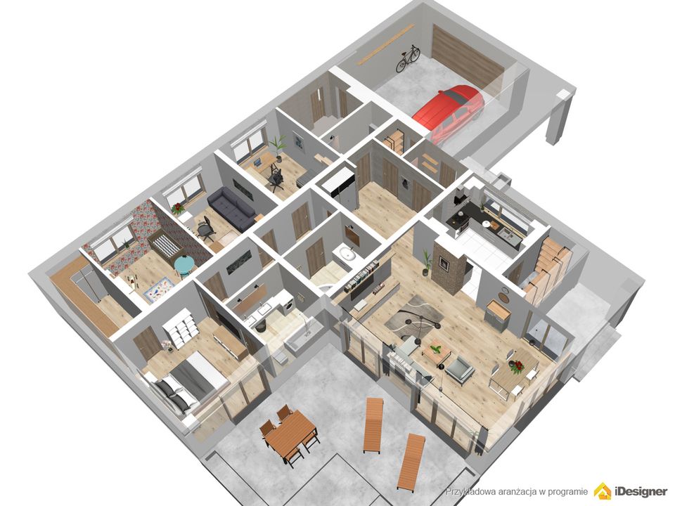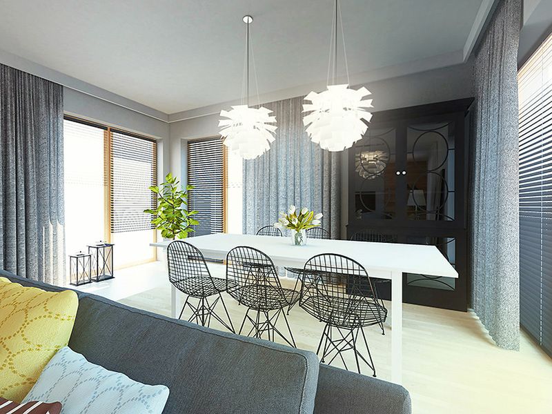 Graficzne opracowanie rzutów poglądowych widocznych na karcie projektu zostało wykonane przez Extradom.pl. Prezentowane przez Extradom.pl wizualizacje wykonane zostały przez autora projektu i należy poczytywać je jedynie za przykład i propozycję wykończenia, wizję architektoniczną autora projektu. Ostateczne wykończenie budynku może nastąpić na wiele sposobów. Szczegółowe rozwiązania zastosowane w oferowanej dokumentacji - w tym również ilość, lokalizacje i wygląd okien, drzwi, kominów - mogą w niewielkim stopniu różnić się od prezentowanej wizualizacji budynku.