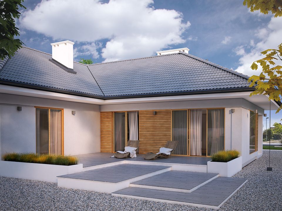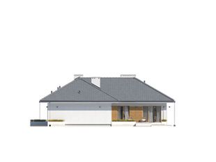 Graficzne opracowanie rzutów poglądowych widocznych na karcie projektu zostało wykonane przez Extradom.pl. Prezentowane przez Extradom.pl wizualizacje wykonane zostały przez autora projektu i należy poczytywać je jedynie za przykład i propozycję wykończenia, wizję architektoniczną autora projektu. Ostateczne wykończenie budynku może nastąpić na wiele sposobów. Szczegółowe rozwiązania zastosowane w oferowanej dokumentacji - w tym również ilość, lokalizacje i wygląd okien, drzwi, kominów - mogą w niewielkim stopniu różnić się od prezentowanej wizualizacji budynku.