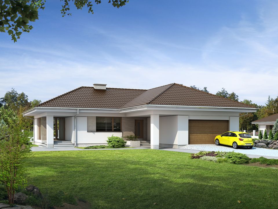 Graficzne opracowanie rzutów poglądowych widocznych na karcie projektu zostało wykonane przez Extradom.pl. Prezentowane przez Extradom.pl wizualizacje wykonane zostały przez autora projektu i należy poczytywać je jedynie za przykład i propozycję wykończenia, wizję architektoniczną autora projektu. Ostateczne wykończenie budynku może nastąpić na wiele sposobów. Szczegółowe rozwiązania zastosowane w oferowanej dokumentacji - w tym również ilość, lokalizacje i wygląd okien, drzwi, kominów - mogą w niewielkim stopniu różnić się od prezentowanej wizualizacji budynku.