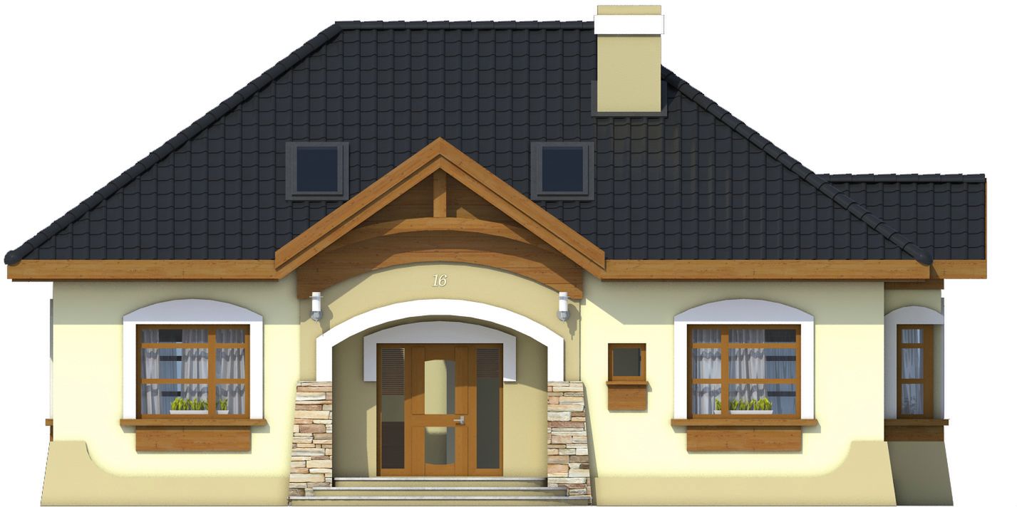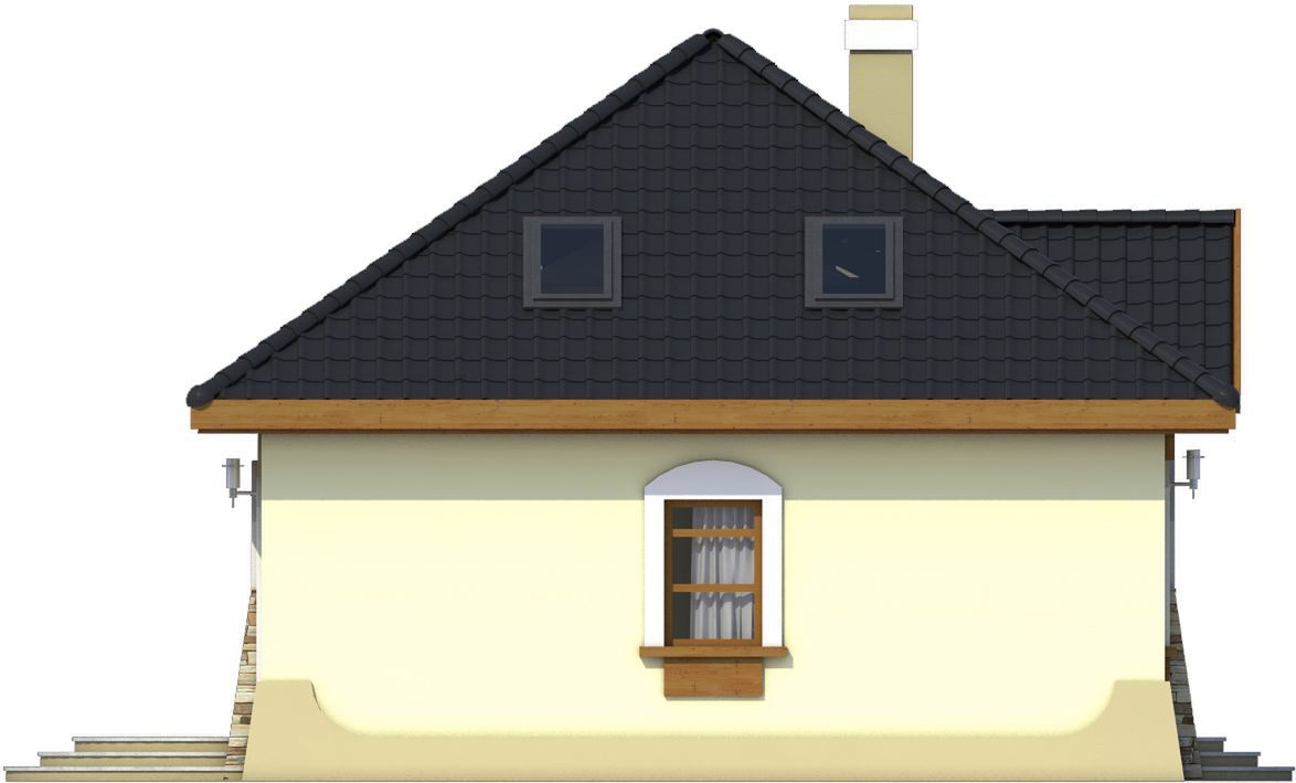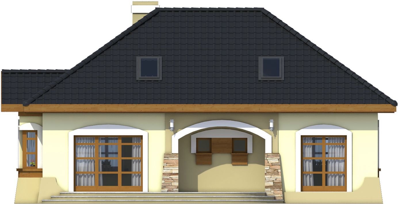 Graficzne opracowanie rzutów poglądowych widocznych na karcie projektu zostało wykonane przez Extradom.pl. Prezentowane przez Extradom.pl wizualizacje wykonane zostały przez autora projektu i należy poczytywać je jedynie za przykład i propozycję wykończenia, wizję architektoniczną autora projektu. Ostateczne wykończenie budynku może nastąpić na wiele sposobów. Szczegółowe rozwiązania zastosowane w oferowanej dokumentacji - w tym również ilość, lokalizacje i wygląd okien, drzwi, kominów - mogą w niewielkim stopniu różnić się od prezentowanej wizualizacji budynku.