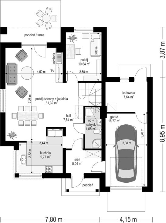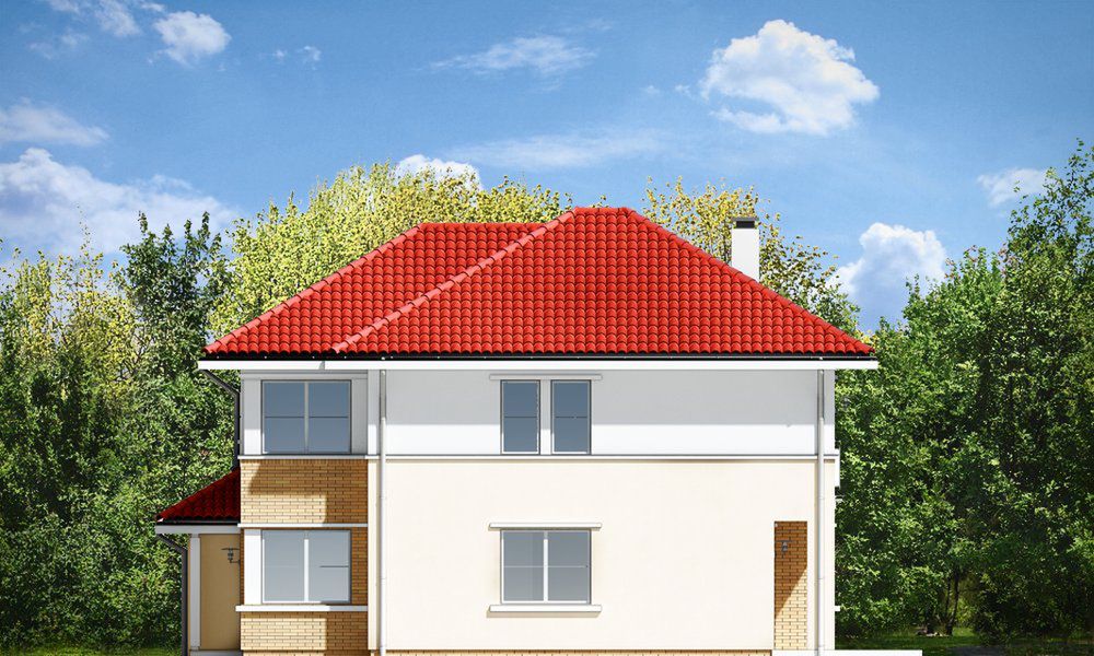 Graficzne opracowanie rzutów poglądowych widocznych na karcie projektu zostało wykonane przez Extradom.pl. Prezentowane przez Extradom.pl wizualizacje wykonane zostały przez autora projektu i należy poczytywać je jedynie za przykład i propozycję wykończenia, wizję architektoniczną autora projektu. Ostateczne wykończenie budynku może nastąpić na wiele sposobów. Szczegółowe rozwiązania zastosowane w oferowanej dokumentacji - w tym również ilość, lokalizacje i wygląd okien, drzwi, kominów - mogą w niewielkim stopniu różnić się od prezentowanej wizualizacji budynku.