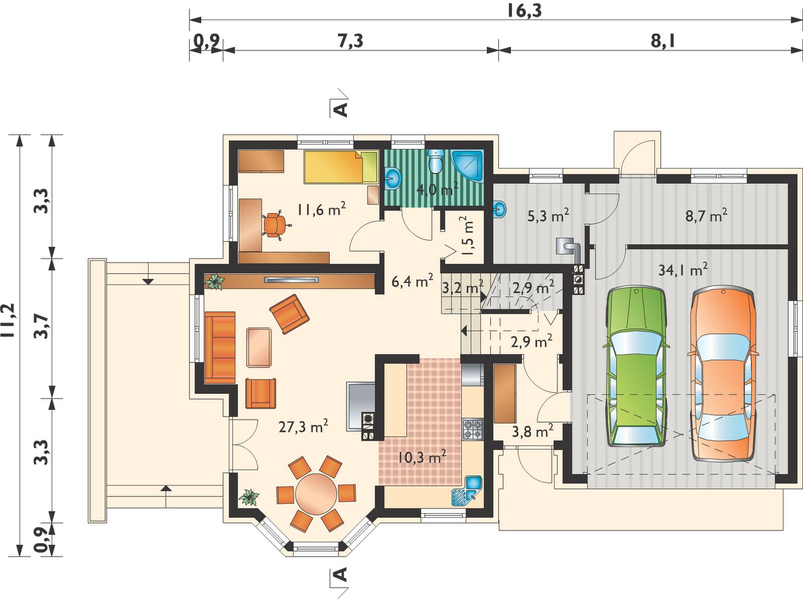 Technologia i konstrukcja: murowana – beton komórkowy. Ściany zewnętrzne: bloczki SOLBET Optimal klasa 400 gr. 24cm + docieplenie płyty FASROCK MAX gr.15cm. Ściany wewnętrzne: bloczki SOLBET Optimal klasa 400 gr.24cm i ściany działowe gr.12cm. Strop: żelbetowy alternatywnie prefabrykowany RECTOR. Konstrukcja dachu: drewniana, jętkowa. Rodzaj schodów: żelbetowe. Typ ogrzewania: kocioł na gaz. Pokrycie dachu: dachówka cementowa BRAAS. Elewacja: tynki silikonowe, silikatowe oraz tynki mineralne BOLIX.