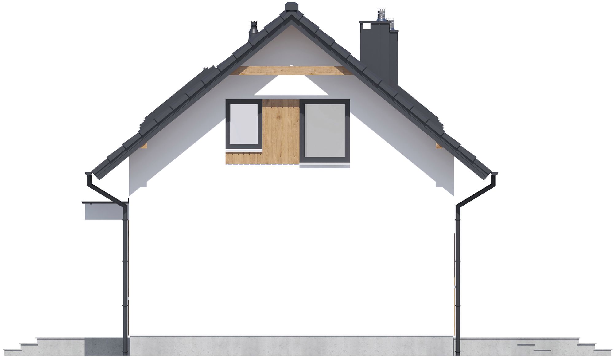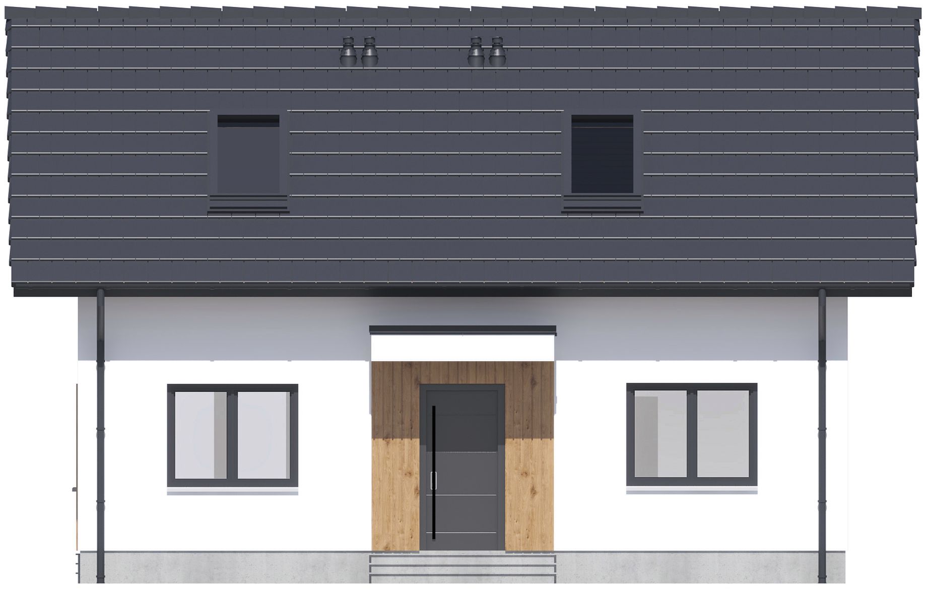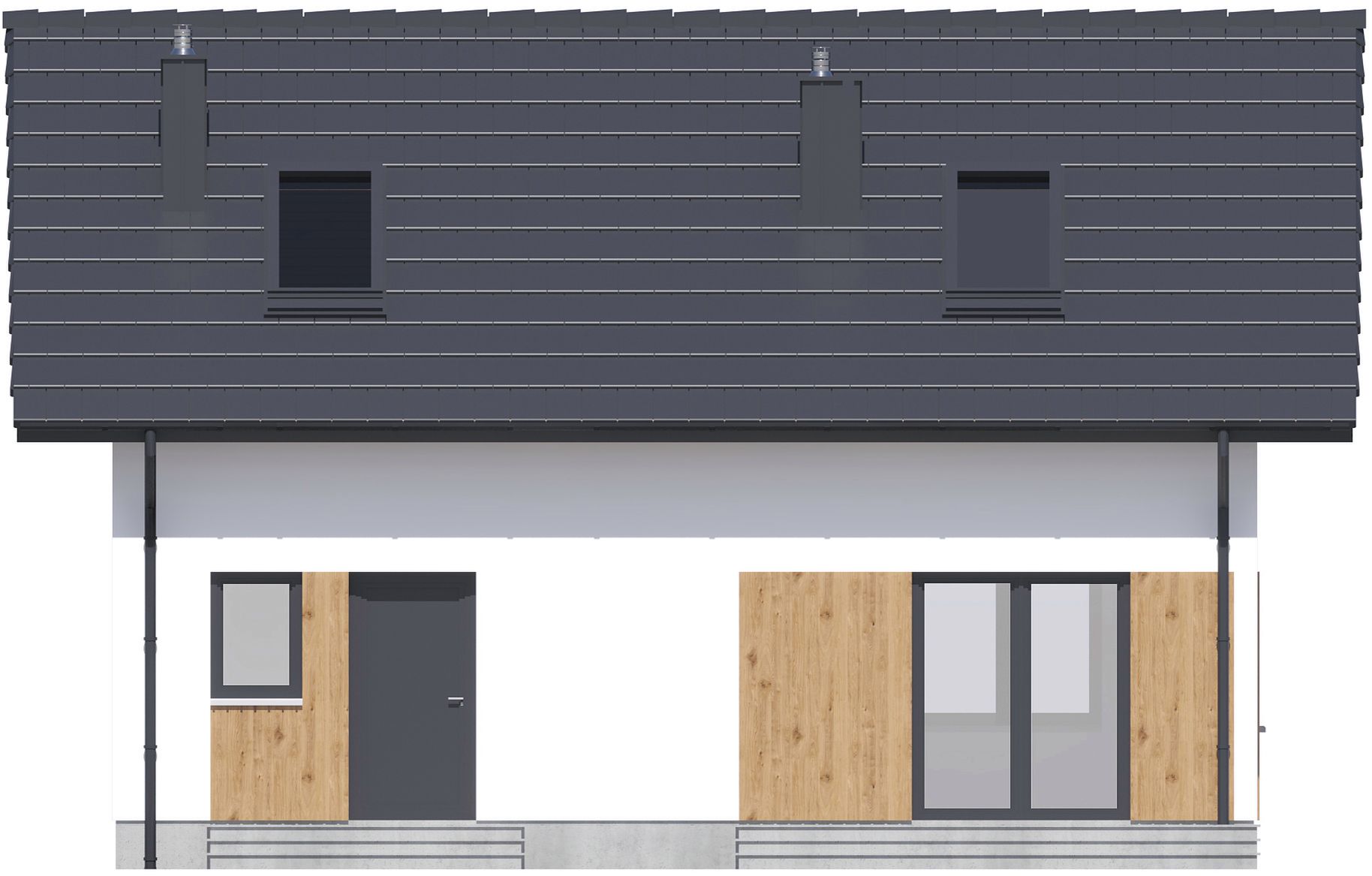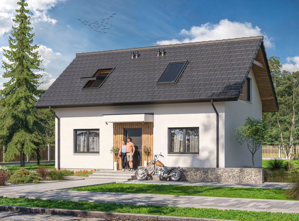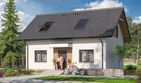 Graficzne opracowanie rzutów poglądowych widocznych na karcie projektu zostało wykonane przez Extradom.pl. Prezentowane przez Extradom.pl wizualizacje wykonane zostały przez autora projektu i należy poczytywać je jedynie za przykład i propozycję wykończenia, wizję architektoniczną autora projektu. Ostateczne wykończenie budynku może nastąpić na wiele sposobów. Szczegółowe rozwiązania zastosowane w oferowanej dokumentacji - w tym również ilość, lokalizacje i wygląd okien, drzwi, kominów - mogą w niewielkim stopniu różnić się od prezentowanej wizualizacji budynku.