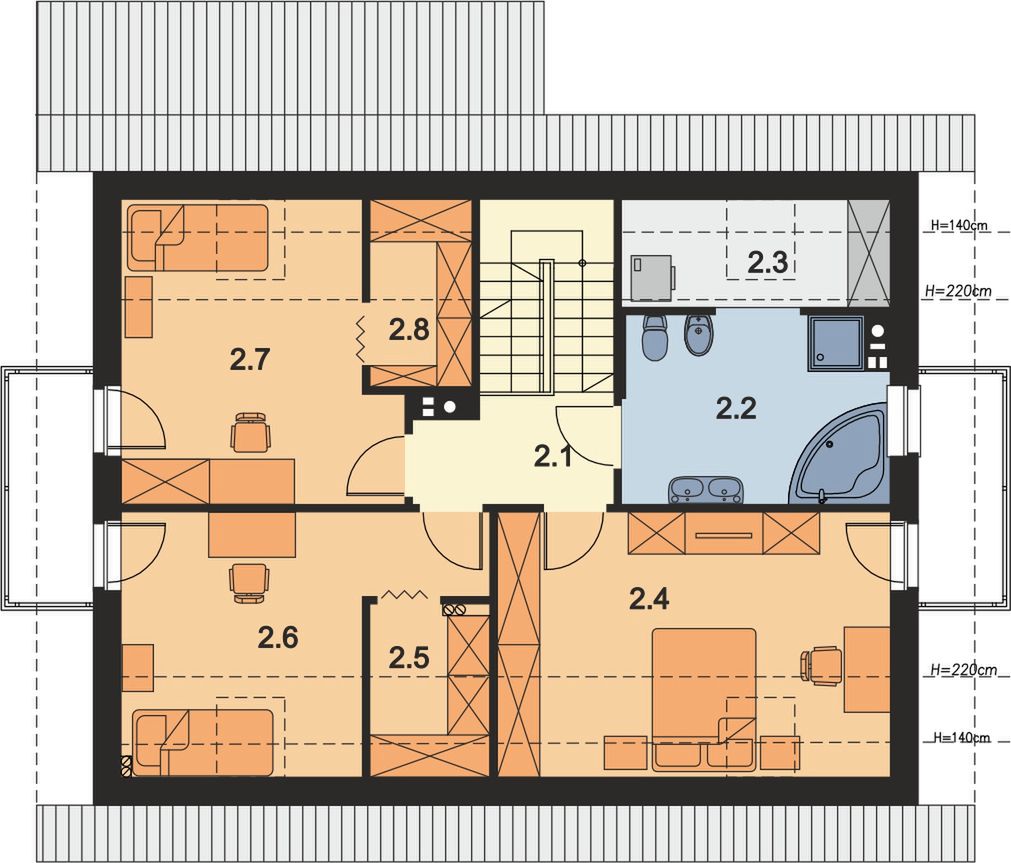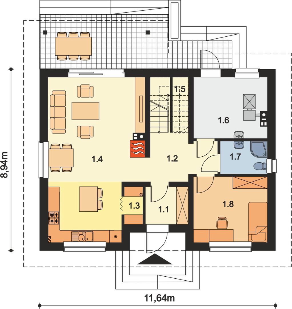 Graficzne opracowanie rzutów poglądowych widocznych na karcie projektu zostało wykonane przez Extradom.pl. Prezentowane przez Extradom.pl wizualizacje wykonane zostały przez autora projektu i należy poczytywać je jedynie za przykład i propozycję wykończenia, wizję architektoniczną autora projektu. Ostateczne wykończenie budynku może nastąpić na wiele sposobów. Szczegółowe rozwiązania zastosowane w oferowanej dokumentacji - w tym również ilość, lokalizacje i wygląd okien, drzwi, kominów - mogą w niewielkim stopniu różnić się od prezentowanej wizualizacji budynku.