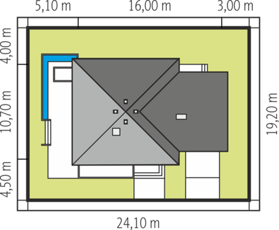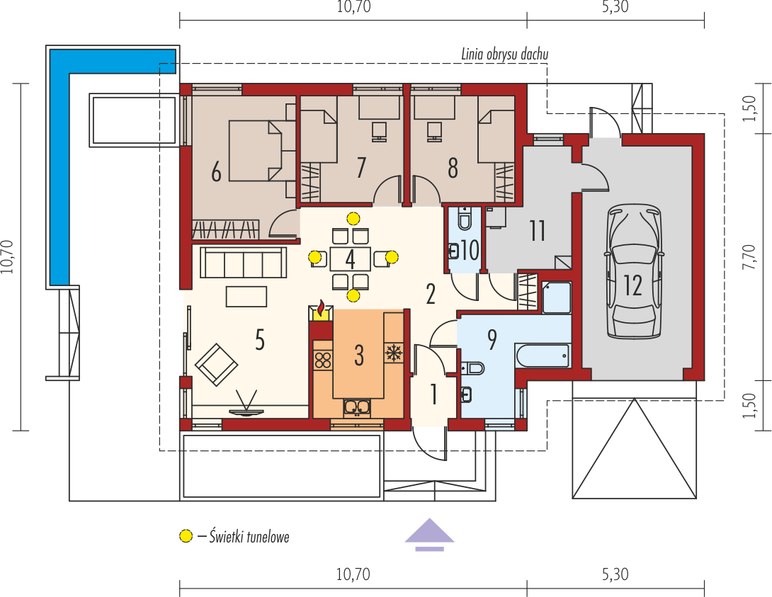 Graficzne opracowanie rzutów poglądowych widocznych na karcie projektu zostało wykonane przez Extradom.pl. Prezentowane przez Extradom.pl wizualizacje wykonane zostały przez autora projektu i należy poczytywać je jedynie za przykład i propozycję wykończenia, wizję architektoniczną autora projektu. Ostateczne wykończenie budynku może nastąpić na wiele sposobów. Szczegółowe rozwiązania zastosowane w oferowanej dokumentacji - w tym również ilość, lokalizacje i wygląd okien, drzwi, kominów - mogą w niewielkim stopniu różnić się od prezentowanej wizualizacji budynku.