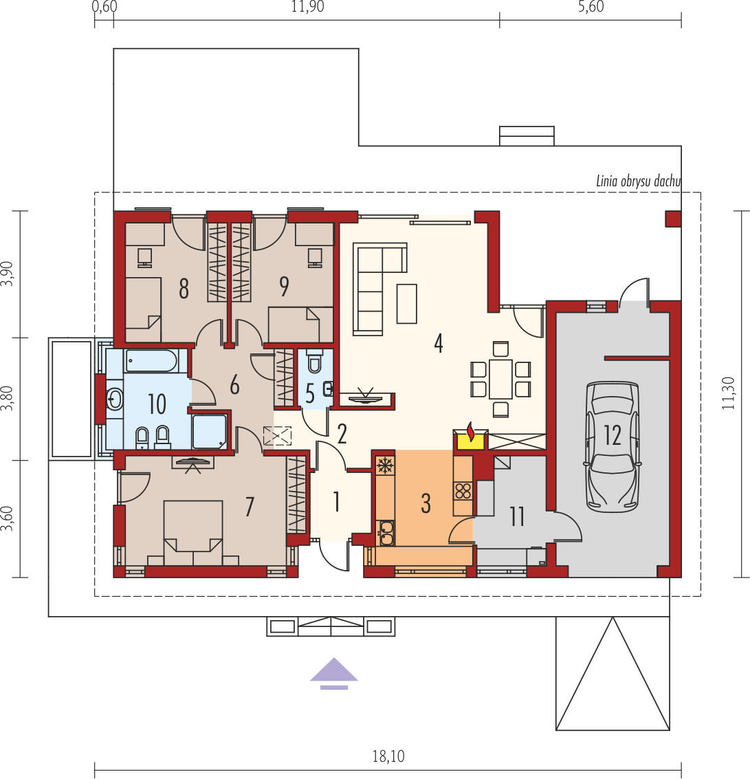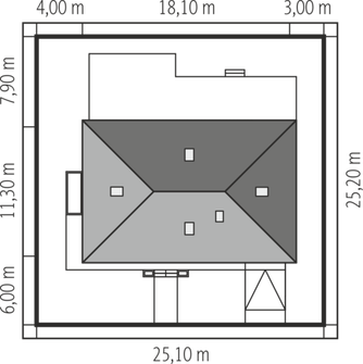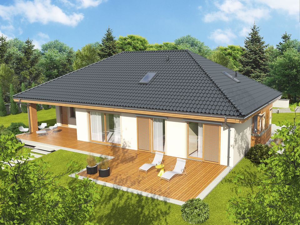 Graficzne opracowanie rzutów poglądowych widocznych na karcie projektu zostało wykonane przez Extradom.pl. Prezentowane przez Extradom.pl wizualizacje wykonane zostały przez autora projektu i należy poczytywać je jedynie za przykład i propozycję wykończenia, wizję architektoniczną autora projektu. Ostateczne wykończenie budynku może nastąpić na wiele sposobów. Szczegółowe rozwiązania zastosowane w oferowanej dokumentacji - w tym również ilość, lokalizacje i wygląd okien, drzwi, kominów - mogą w niewielkim stopniu różnić się od prezentowanej wizualizacji budynku.