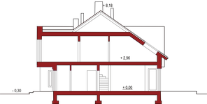 Ściany: bloczek z gazobetonu 24 cm, styropian Termo Organika 20 cm, tynk. Strop: Teriva 1. Dach: dwuspadowy, nachylenie 35 st. , więźba drewniana, dachówka ceramiczna. Ocieplenie dachu: wełna mineralna ISOVER Uni Mata. Ogrzewanie: gazowe. Okna dachowe: VELUX.