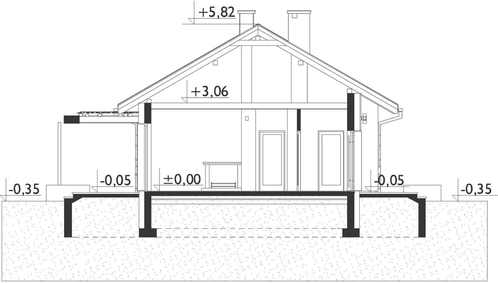 Wersja technologiczna: murowana - beton komórkowy. Strop: dolny pas wiązarów MITEK. Typ schodów: brak. Konstrukcja dachu: prefabrykowane wiązary drewniane MITEK Industries Polska. Typ ogrzewania: Kocioł na gaz. Dostępna wersja z pompą ciepła: Tak. Wentylacja: grawitacyjna. Ściany zewnętrzne: 24 cm beton komórkowy SOLBET Optimal. Ściany wewnętrzne: 24 cm beton komórkowy SOLBET Optimal. Ściany wewnętrzne działowe: 12 cm beton komórkowy SOLBET Optimal. Wentylacja: grawitacyjna.