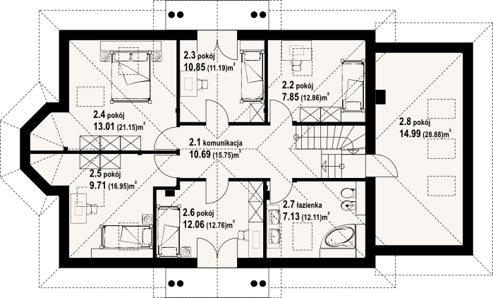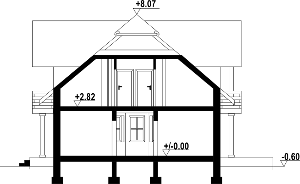 Wysokość ścianki kolankowej: 0.97 m. Strop: płyta żelbetowa. Pokrycie dachu: dachówka ceramiczna. Ściany zewnętrzne: bloczki z betonu komórkowego + styropian. Ściany wewnętrzne: bloczki z betonu komórkowego. Typ ogrzewania: kocioł gazowy lub kocioł na paliwo stałe. Inne: okna połaciowe Velux.