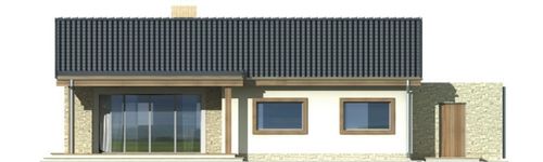 Dom parterowy Antek wersja B z pojedynczym garażem posiada bardzo prostą, minimalistyczną formę z dachem o niewielkim kącie nachylenia. Nowoczesnego oraz indywidualnego charakteru nadają mu kamienna okładzina wraz dużymi przeszkleniami, rozświetlającymi wnętrze. Do bryły domu przylega jednostanowiskowy garaż z płaskim dachem.