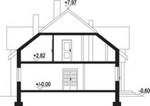 Wysokość ścianki kolankowej: 0.8 m. Ilość drewna na więźbę: 11.9 m³. Strop: płyta żelbetowa. Pokrycie dachu: dachówka ceramiczna. Ściany zewnętrzne: pustaki ceramiczne + styropian. Ściany wewnętrzne: pustaki ceramiczne. Typ ogrzewania: kocioł gazowy. Inne: okna połaciowe Fakro.