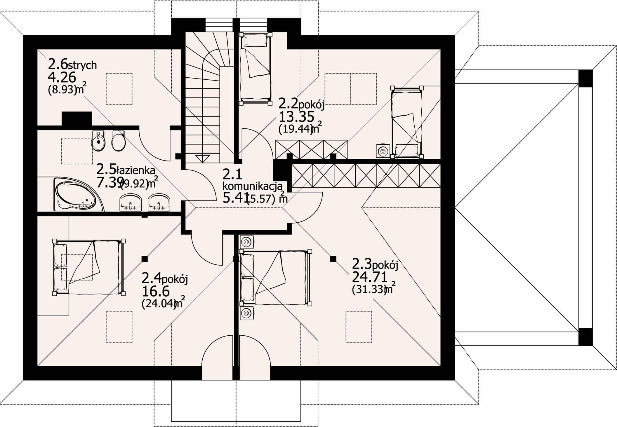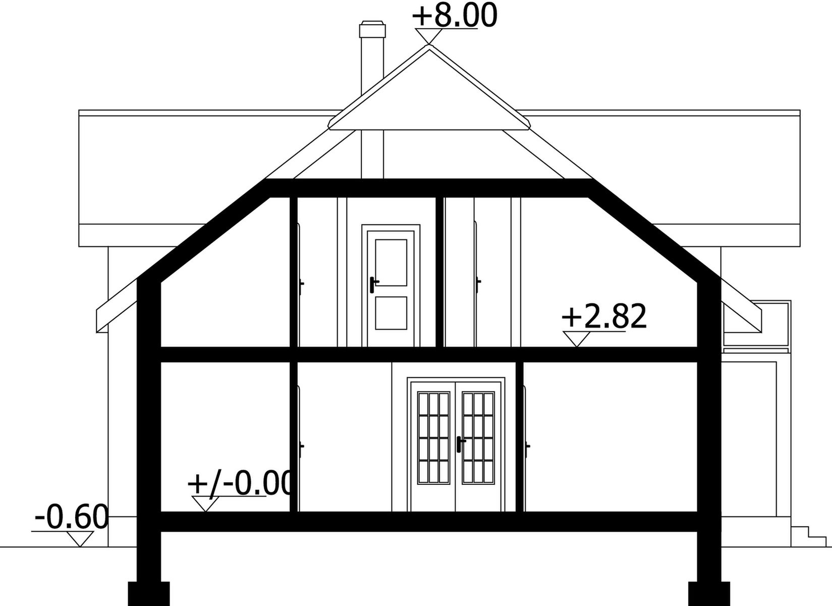 Wysokość ścianki kolankowej: 1 m. Strop: płyta żelbetowa. Pokrycie dachu: dachówka ceramiczna. Ściany zewnętrzne: pustaki ceramiczne + styropian. Ściany wewnętrzne: pustaki ceramiczne. Typ ogrzewania: kocioł gazowy lub kocioł na paliwo stałe. Inne: okna połaciowe Fakro.