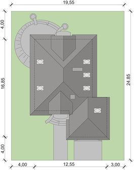 Graficzne opracowanie rzutów poglądowych widocznych na karcie projektu zostało wykonane przez Extradom.pl. Prezentowane przez Extradom.pl wizualizacje wykonane zostały przez autora projektu i należy poczytywać je jedynie za przykład i propozycję wykończenia, wizję architektoniczną autora projektu. Ostateczne wykończenie budynku może nastąpić na wiele sposobów. Szczegółowe rozwiązania zastosowane w oferowanej dokumentacji - w tym również ilość, lokalizacje i wygląd okien, drzwi, kominów - mogą w niewielkim stopniu różnić się od prezentowanej wizualizacji budynku.