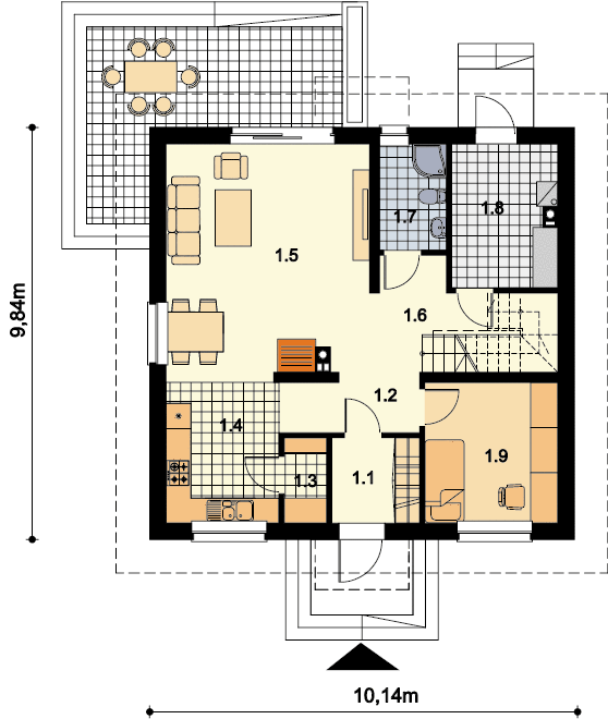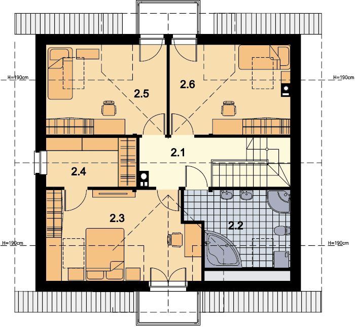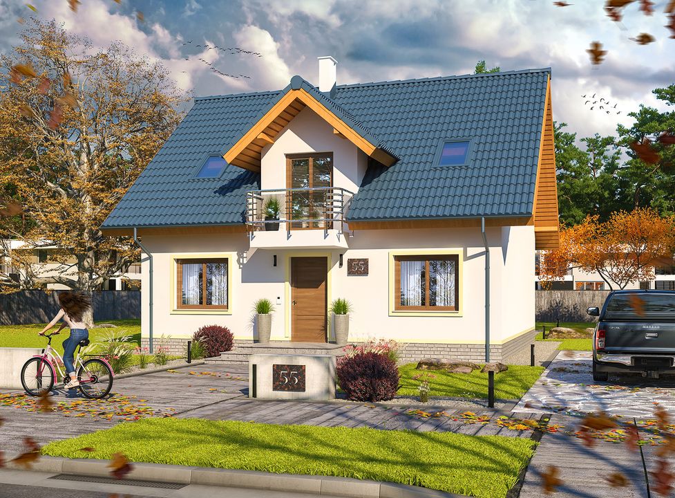 Graficzne opracowanie rzutów poglądowych widocznych na karcie projektu zostało wykonane przez Extradom.pl. Prezentowane przez Extradom.pl wizualizacje wykonane zostały przez autora projektu i należy poczytywać je jedynie za przykład i propozycję wykończenia, wizję architektoniczną autora projektu. Ostateczne wykończenie budynku może nastąpić na wiele sposobów. Szczegółowe rozwiązania zastosowane w oferowanej dokumentacji - w tym również ilość, lokalizacje i wygląd okien, drzwi, kominów - mogą w niewielkim stopniu różnić się od prezentowanej wizualizacji budynku.