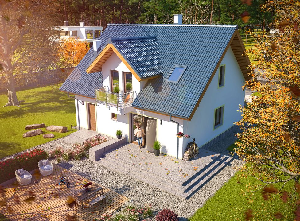 Wybrałem projekt domu parterowego z poddaszem użytkowym Apollo WOE1031, ponieważ spodobał mi się gdy go tylko zobaczyłem. Jego parametry i uwzględnione w nim rozwiązania odpowiadały moim oczekiwaniom, a rozmieszczenie pomieszczeń pasowało mi pod względem usytuowania mojej działki w stosunku do stron świata. Zdecydowałem się na budowę systemem gospodarczym, więc większość prac wykonałem samodzielnie. Na szczęście podczas całej realizacji nie natrafiłem na żadne problemy, a postawienie domu wraz z wykonaniem wewnętrznych wykończeń zajęło mi 2 lata. Postanowiliśmy wprowadzić zmianę w zalecanej technologi i zamiast stropu gęstożebrowego zrobiliśmy lany, monolityczny. Z racji tego kierownik budowy musiał zrobić inne wyliczenia odnośnie tej konstrukcji. Budynek w moim przypadku został wymurowany z bloczków Ytong, a z zewnątrz ociepliłem go 15 cm warstwą grafitowego styropianu. Do projektu Apollo WOE1031 wprowadziłem kilka nowych rozwiązań. Zrezygnowałem z wykonania garderoby, a jej powierzchnię przyłączyłem do znajdującej się obok sypialni. Dodatkowo, aby powiększyć kuchnię zlikwidowałem ścianki tworzące spiżarnię. Zamiast pierwotnie proponowanych zakręcanych schodów, zrobiłem zwykłe lane. Do więźby dachowej zamocowałem dodatkowe deski, dzięki czemu nad poddaszem mogłem zrobić w pełni funkcjonalny strych. Muszę przyznać, że był to naprawdę dobry pomysł. Jedyne co zmieniłbym na chwilę obecną to inne rozmieszczenie wejścia do górnej łazienki, gdyż przy lanym stropie i betonowych schodach nie jest ono do końca praktyczne. Cztery słupy na poddaszu nieco przeszkadzają, więc teraz rozważyłbym ich inne położenie. Zdecydowałem się na wersję lustrzaną projektu Apollo WOE1031. Ułożenie domu w stosunku do stron świata jest dokładnie takie jak chciałem, gdyż kuchnia znajduje się od północy, a salon z tarasem na południu. Aby dodatkowo oświetlić klatkę schodową na korytarzu obok niej wstawiłem dodatkowe okno. W nowym domu mieszkam dosyć krótko, więc póki co nie dostrzegam w nim większych mankamentów. Pozdrawiam.