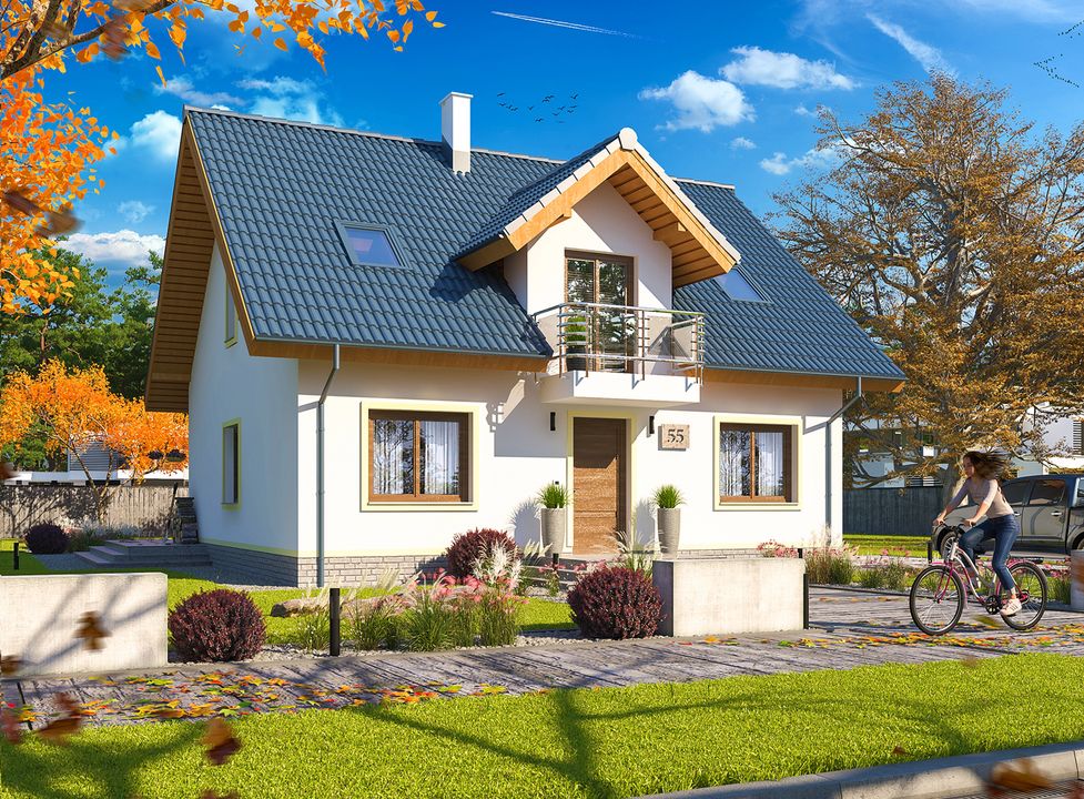 Graficzne opracowanie rzutów poglądowych widocznych na karcie projektu zostało wykonane przez Extradom.pl. Prezentowane przez Extradom.pl wizualizacje wykonane zostały przez autora projektu i należy poczytywać je jedynie za przykład i propozycję wykończenia, wizję architektoniczną autora projektu. Ostateczne wykończenie budynku może nastąpić na wiele sposobów. Szczegółowe rozwiązania zastosowane w oferowanej dokumentacji - w tym również ilość, lokalizacje i wygląd okien, drzwi, kominów - mogą w niewielkim stopniu różnić się od prezentowanej wizualizacji budynku.