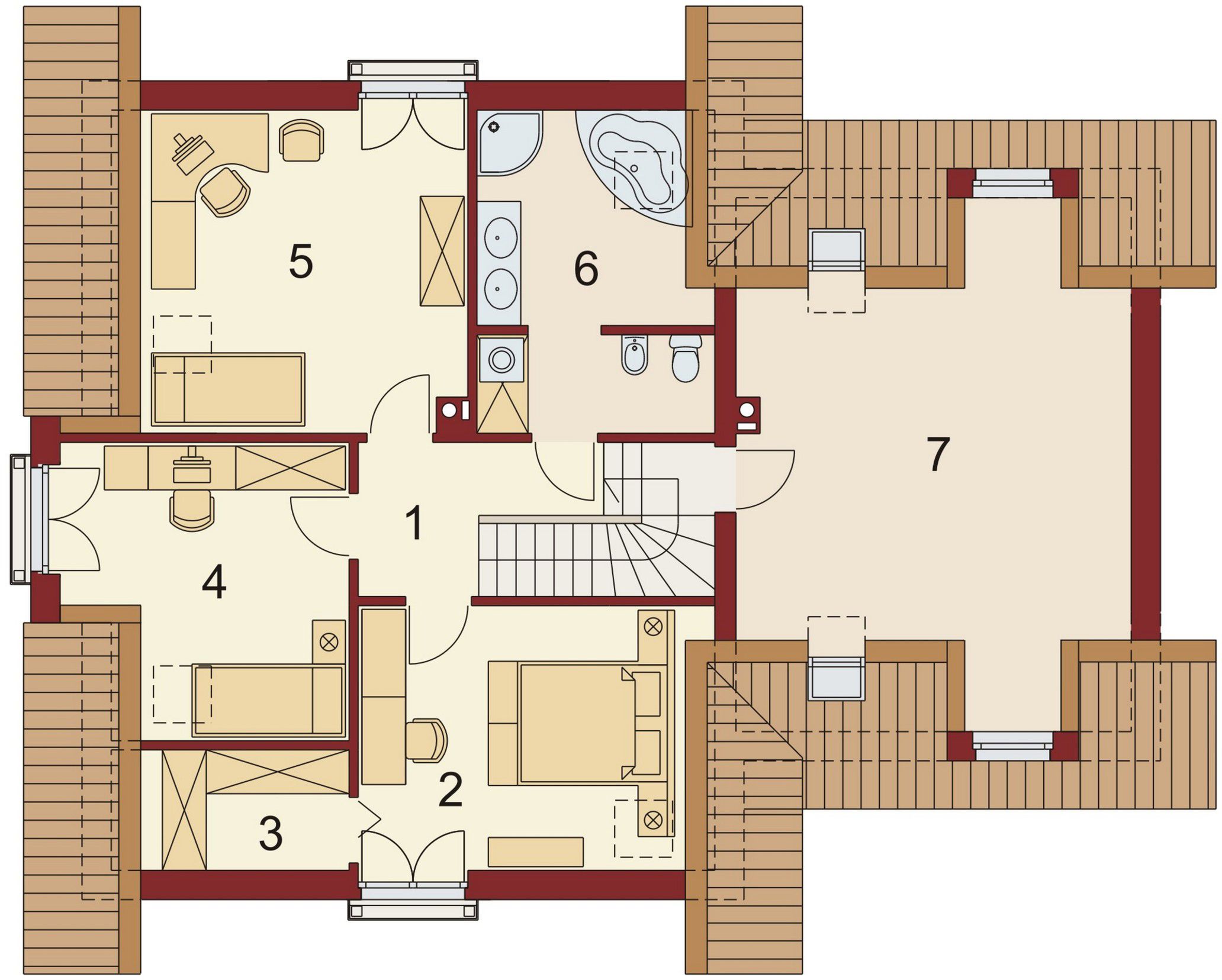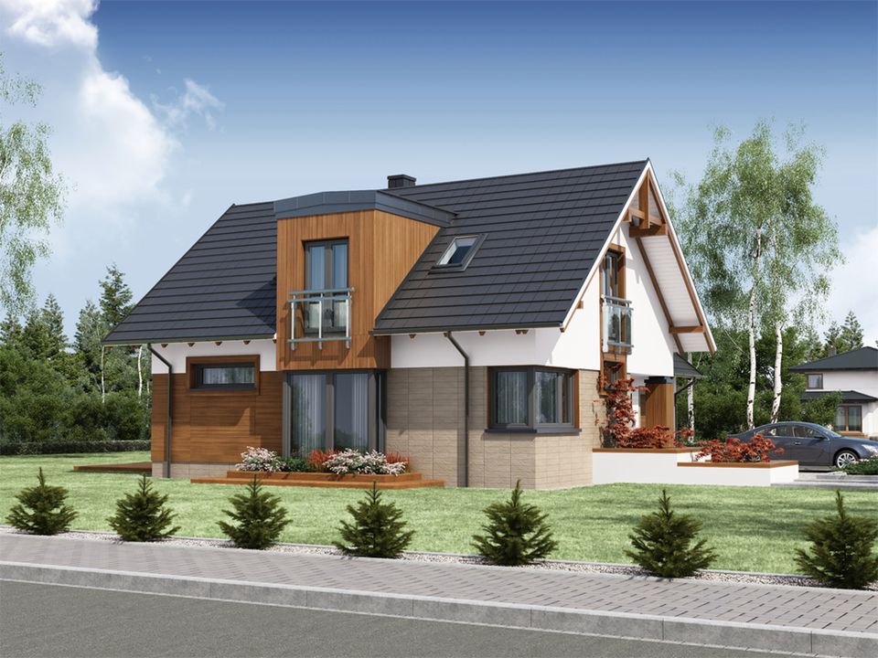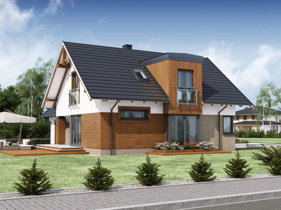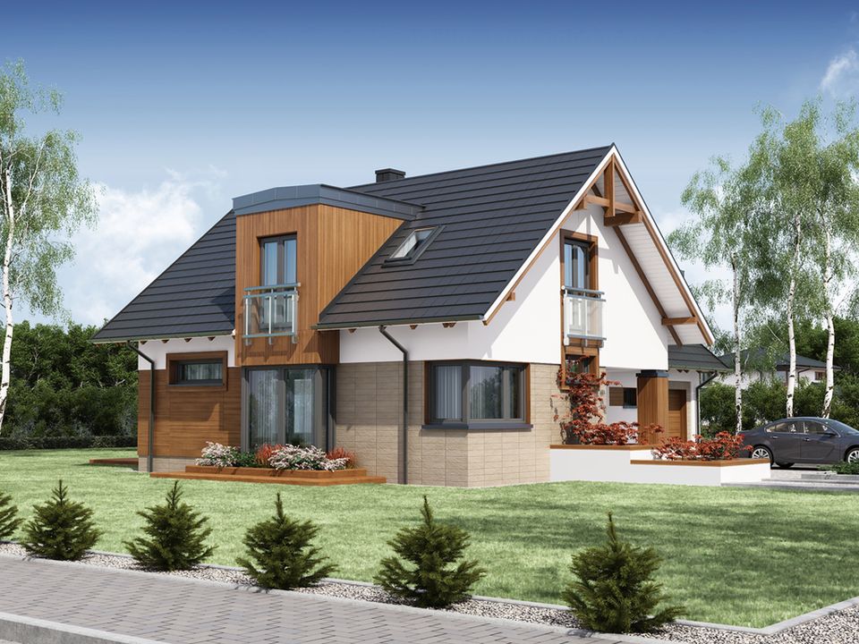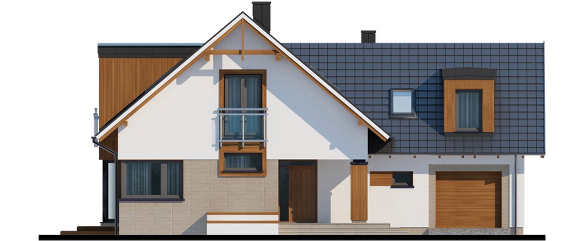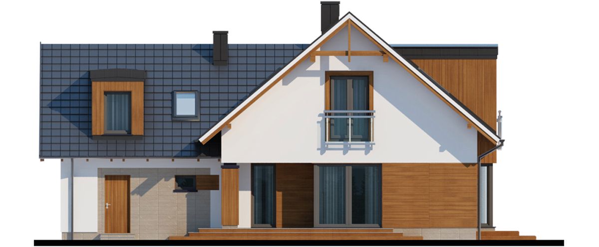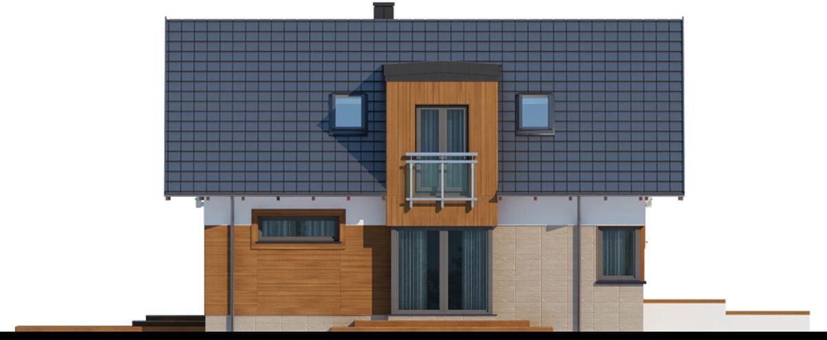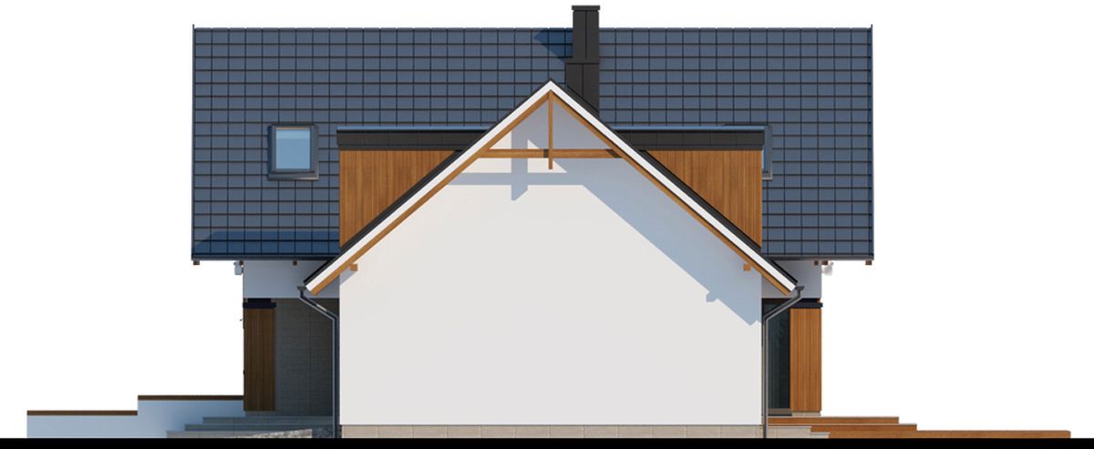 Graficzne opracowanie rzutów poglądowych widocznych na karcie projektu zostało wykonane przez Extradom.pl. Prezentowane przez Extradom.pl wizualizacje wykonane zostały przez autora projektu i należy poczytywać je jedynie za przykład i propozycję wykończenia, wizję architektoniczną autora projektu. Ostateczne wykończenie budynku może nastąpić na wiele sposobów. Szczegółowe rozwiązania zastosowane w oferowanej dokumentacji - w tym również ilość, lokalizacje i wygląd okien, drzwi, kominów - mogą w niewielkim stopniu różnić się od prezentowanej wizualizacji budynku.