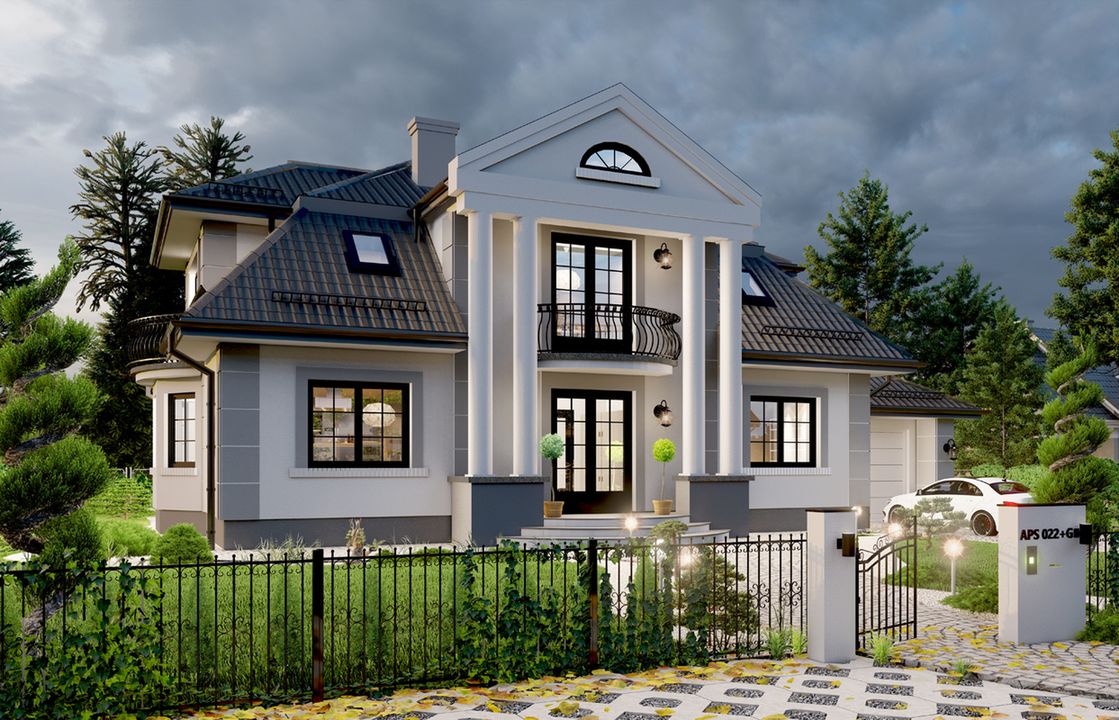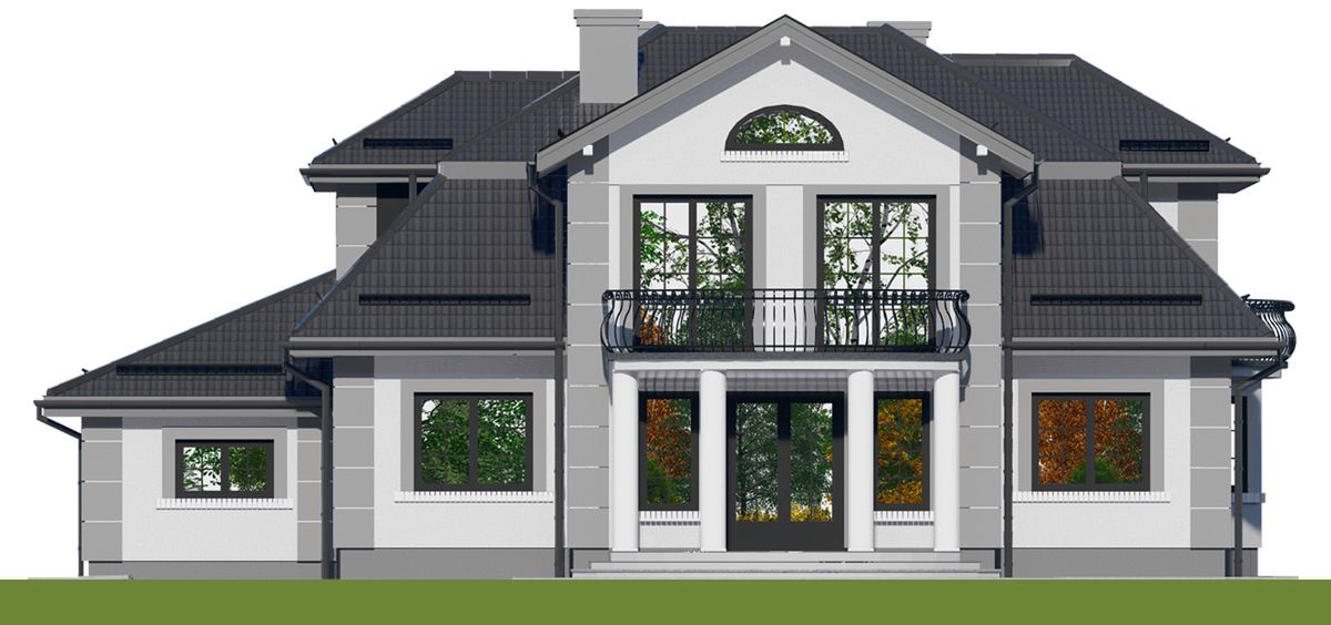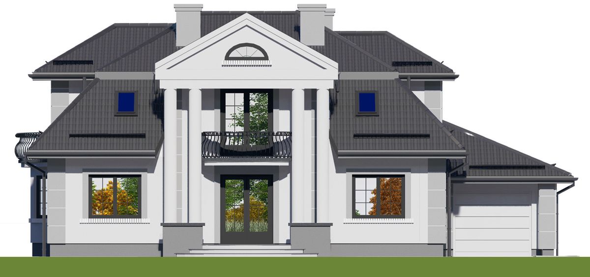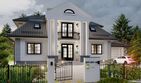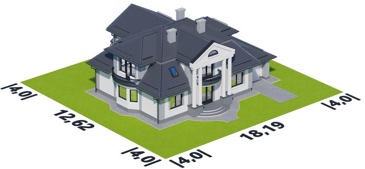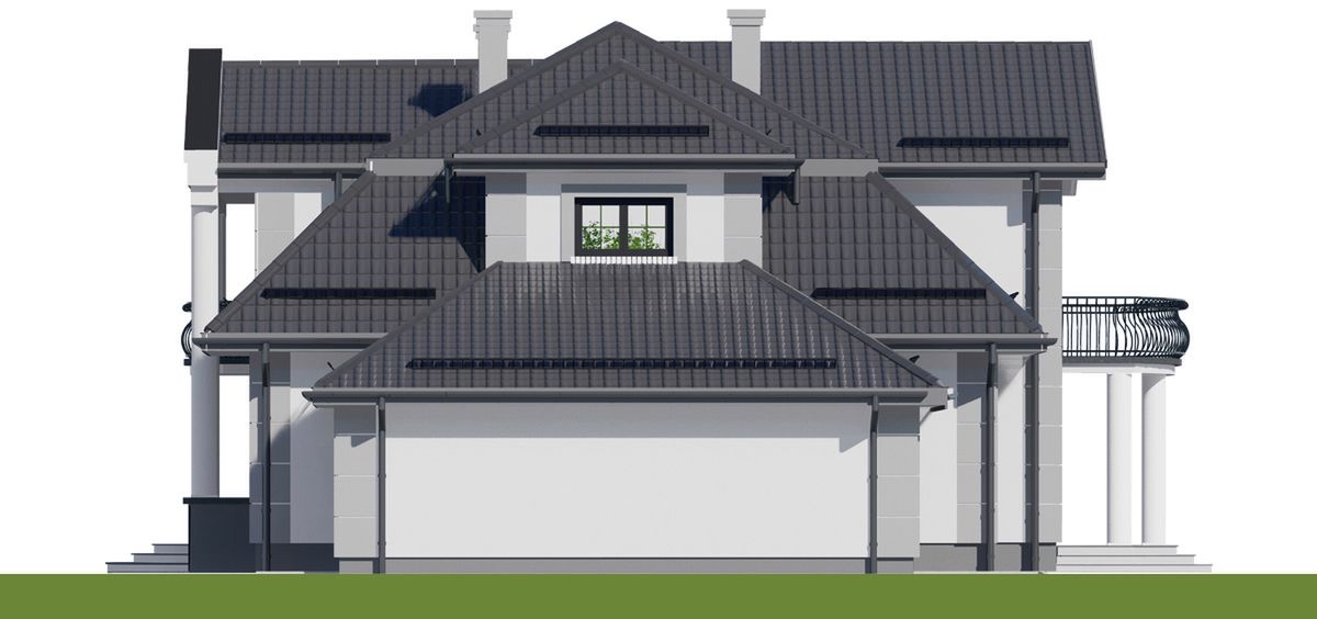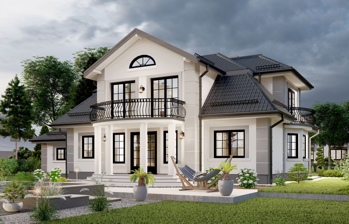Graficzne opracowanie rzutów poglądowych widocznych na karcie projektu zostało wykonane przez Extradom.pl. Prezentowane przez Extradom.pl wizualizacje wykonane zostały przez autora projektu i należy poczytywać je jedynie za przykład i propozycję wykończenia, wizję architektoniczną autora projektu. Ostateczne wykończenie budynku może nastąpić na wiele sposobów. Szczegółowe rozwiązania zastosowane w oferowanej dokumentacji - w tym również ilość, lokalizacje i wygląd okien, drzwi, kominów - mogą w niewielkim stopniu różnić się od prezentowanej wizualizacji budynku.