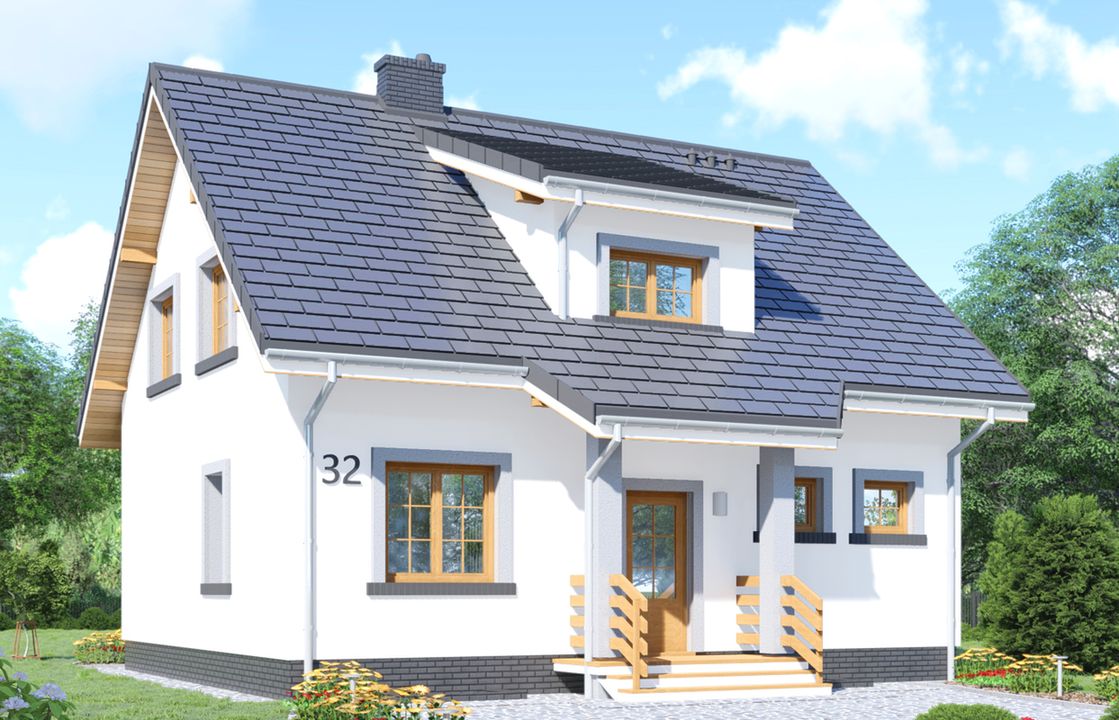 Graficzne opracowanie rzutów poglądowych widocznych na karcie projektu zostało wykonane przez Extradom.pl. Prezentowane przez Extradom.pl wizualizacje wykonane zostały przez autora projektu i należy poczytywać je jedynie za przykład i propozycję wykończenia, wizję architektoniczną autora projektu. Ostateczne wykończenie budynku może nastąpić na wiele sposobów. Szczegółowe rozwiązania zastosowane w oferowanej dokumentacji - w tym również ilość, lokalizacje i wygląd okien, drzwi, kominów - mogą w niewielkim stopniu różnić się od prezentowanej wizualizacji budynku.
