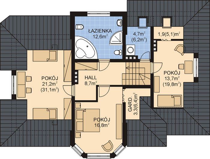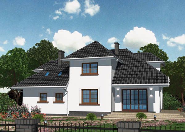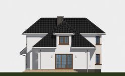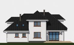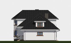 Graficzne opracowanie rzutów poglądowych widocznych na karcie projektu zostało wykonane przez Extradom.pl. Prezentowane przez Extradom.pl wizualizacje wykonane zostały przez autora projektu i należy poczytywać je jedynie za przykład i propozycję wykończenia, wizję architektoniczną autora projektu. Ostateczne wykończenie budynku może nastąpić na wiele sposobów. Szczegółowe rozwiązania zastosowane w oferowanej dokumentacji - w tym również ilość, lokalizacje i wygląd okien, drzwi, kominów - mogą w niewielkim stopniu różnić się od prezentowanej wizualizacji budynku.