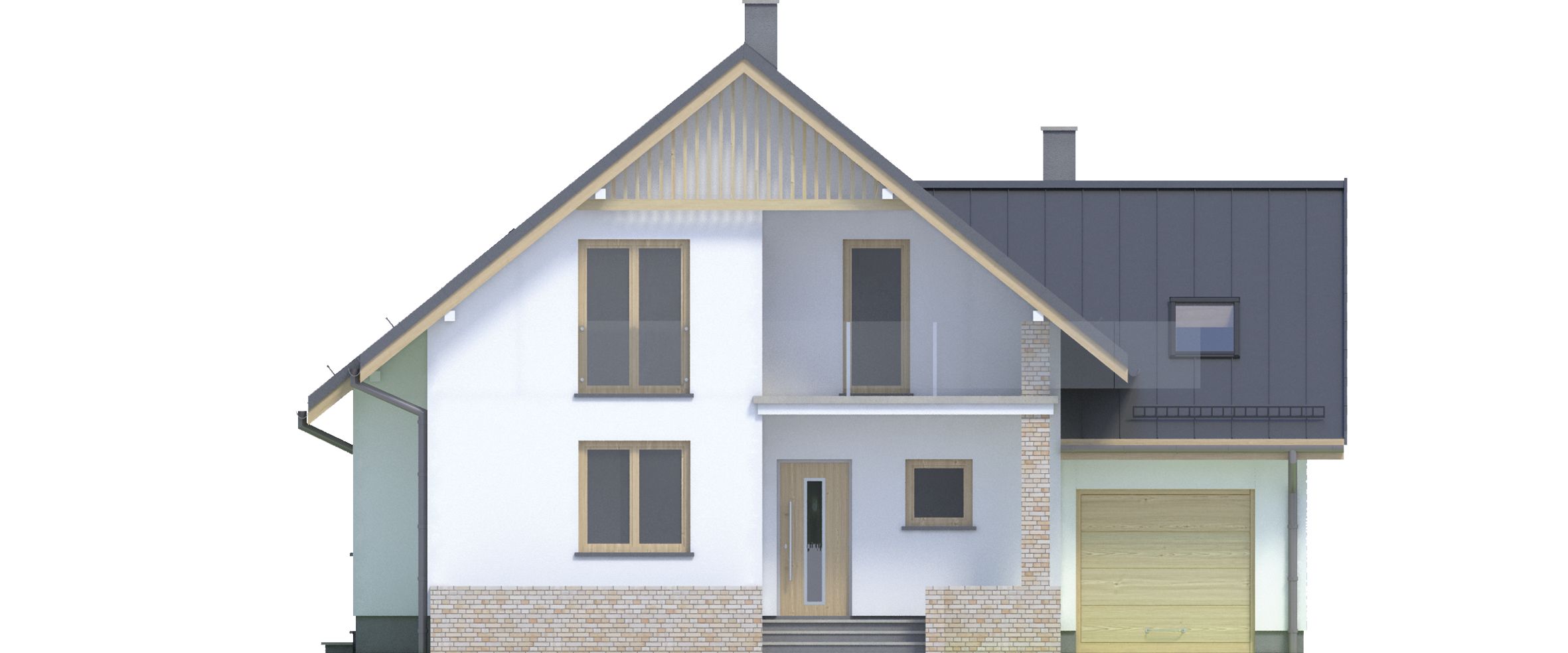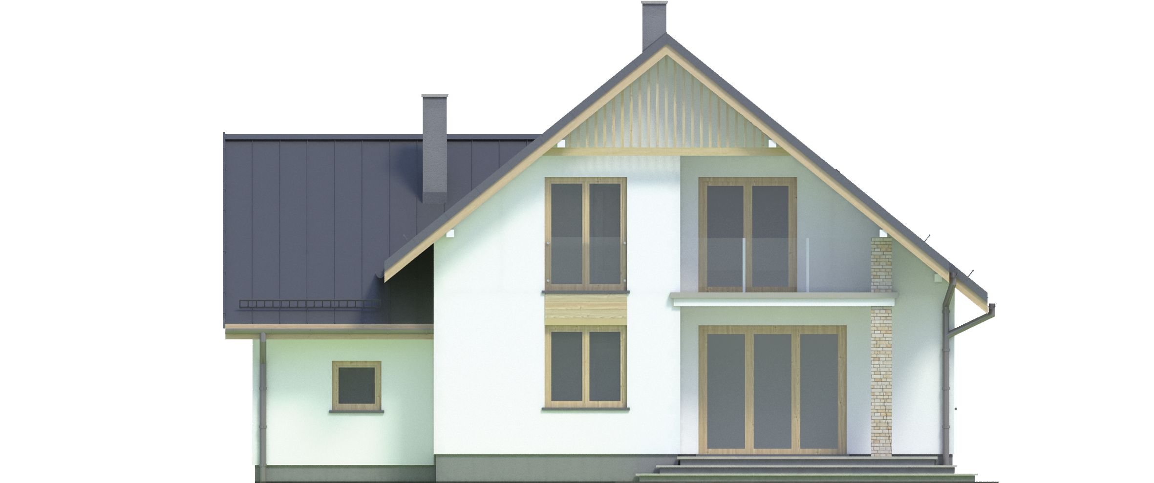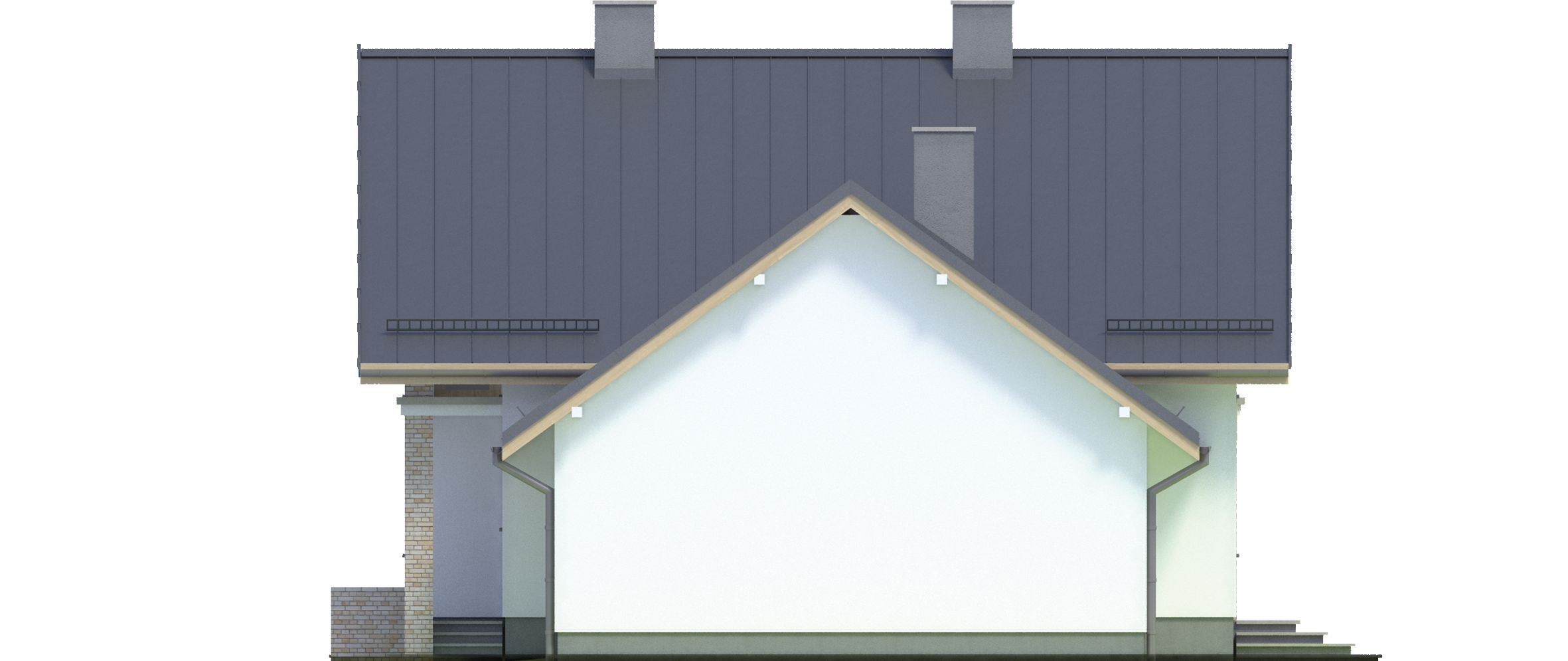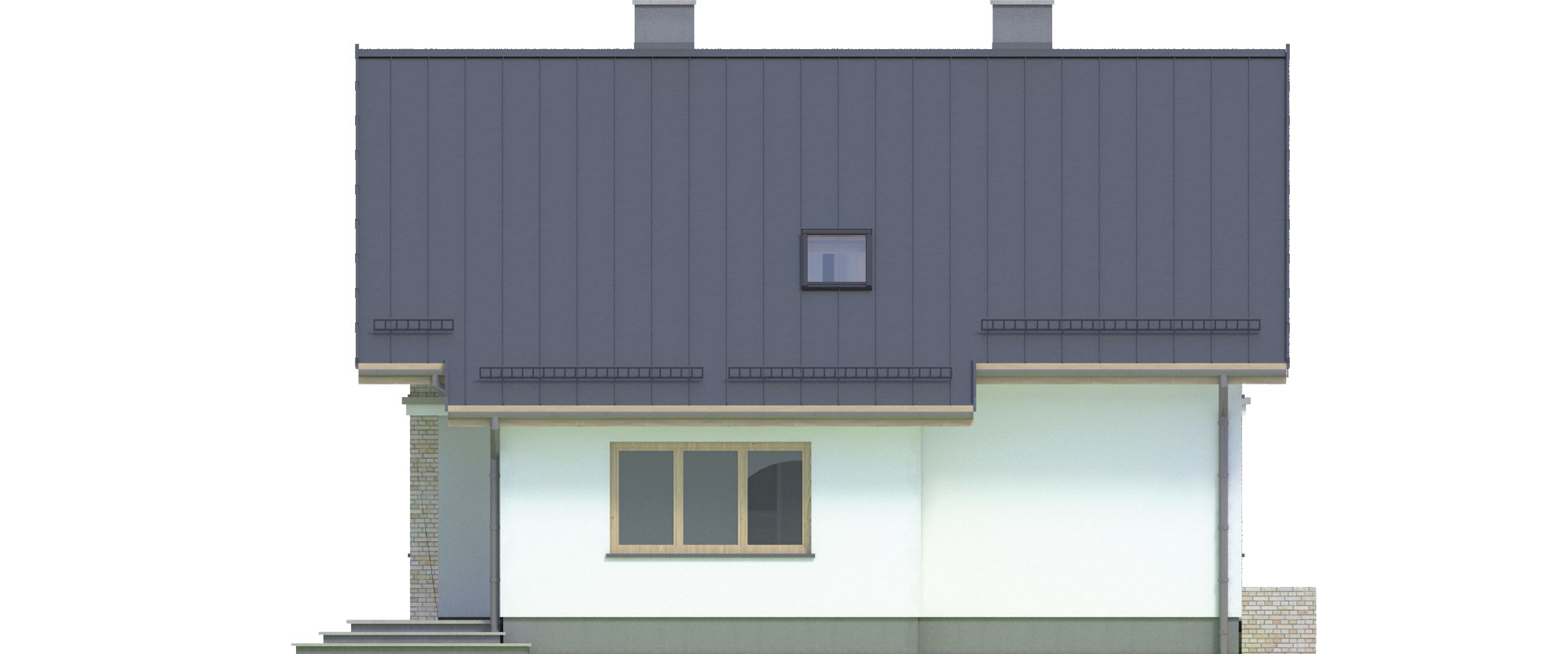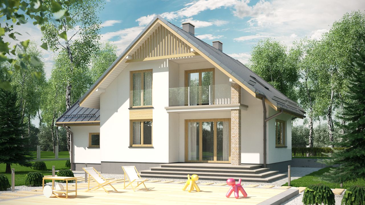 Graficzne opracowanie rzutów poglądowych widocznych na karcie projektu zostało wykonane przez Extradom.pl. Prezentowane przez Extradom.pl wizualizacje wykonane zostały przez autora projektu i należy poczytywać je jedynie za przykład i propozycję wykończenia, wizję architektoniczną autora projektu. Ostateczne wykończenie budynku może nastąpić na wiele sposobów. Szczegółowe rozwiązania zastosowane w oferowanej dokumentacji - w tym również ilość, lokalizacje i wygląd okien, drzwi, kominów - mogą w niewielkim stopniu różnić się od prezentowanej wizualizacji budynku.